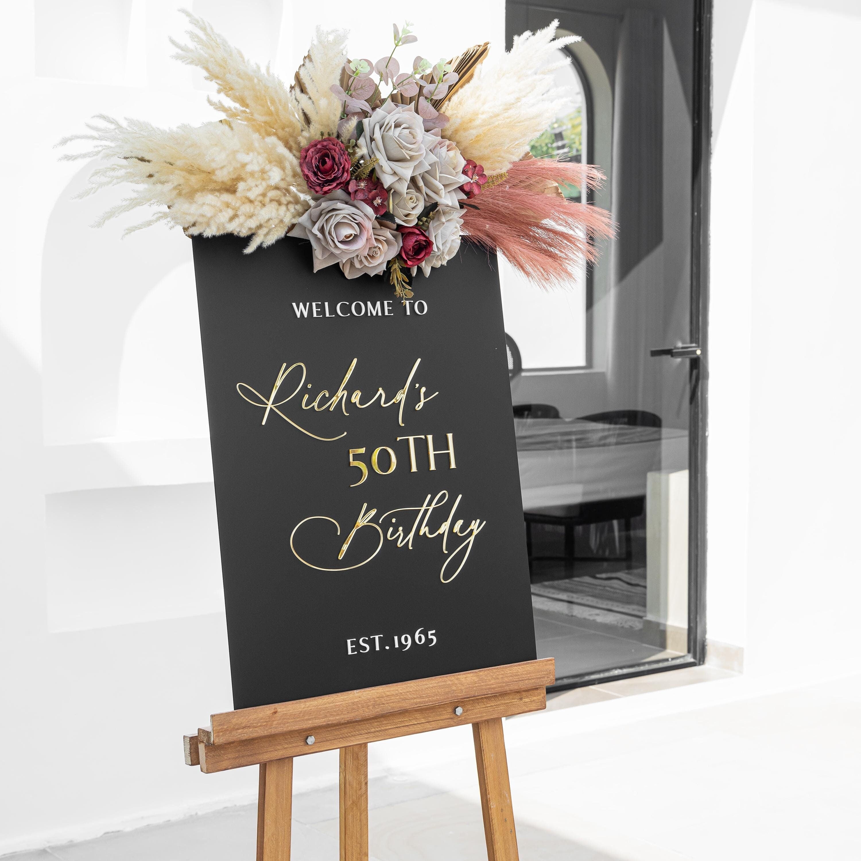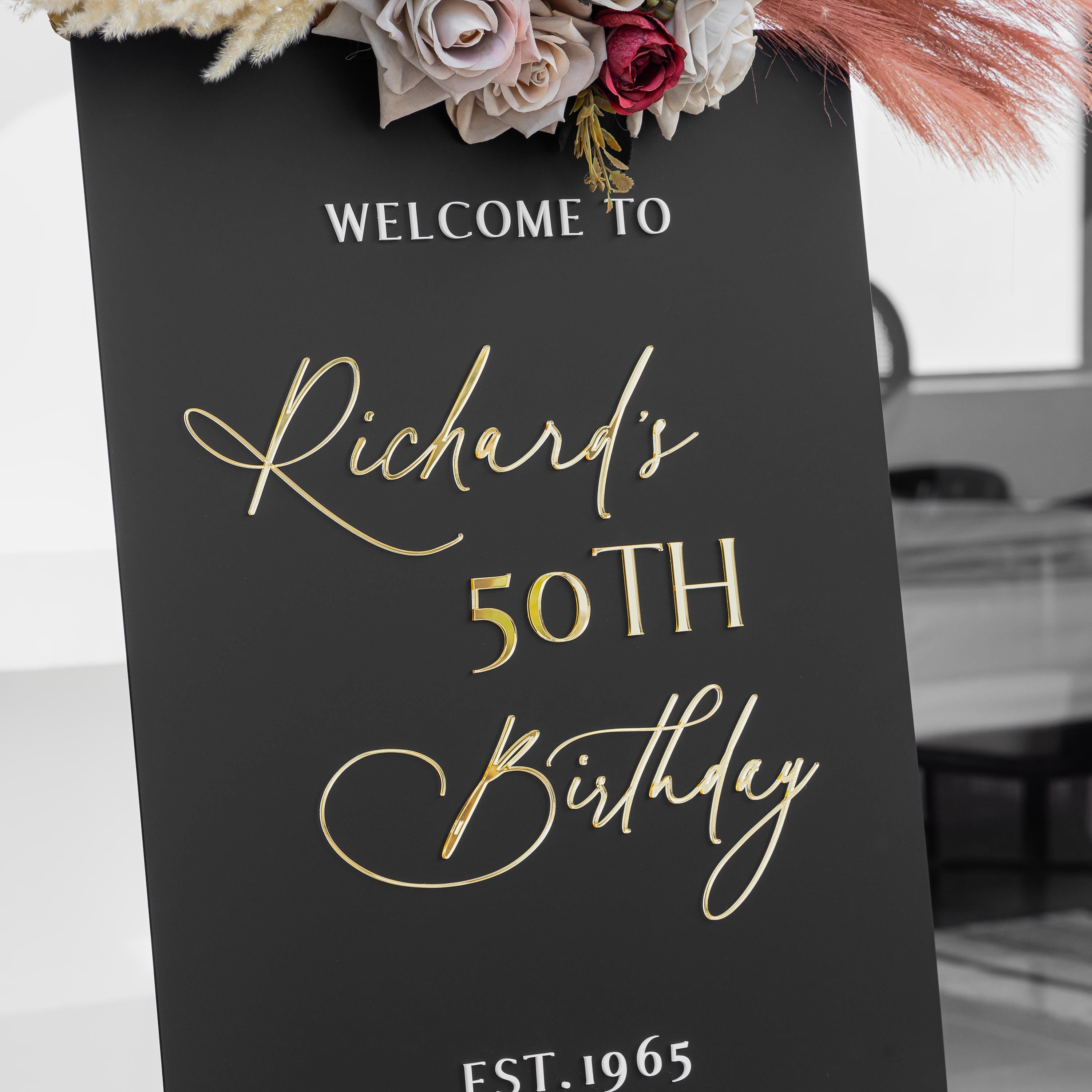 This modern birthday welcome sign is crafted from high-quality Matte Black acrylic. The lettering is raised using 3D Mirror Gold acrylic sheet and small white letters are done with UV printing, ensuring a long-lasting, luxurious finish. Unlike other signs that use vinyl or stickers, our signs maintain superior quality and elegance.
