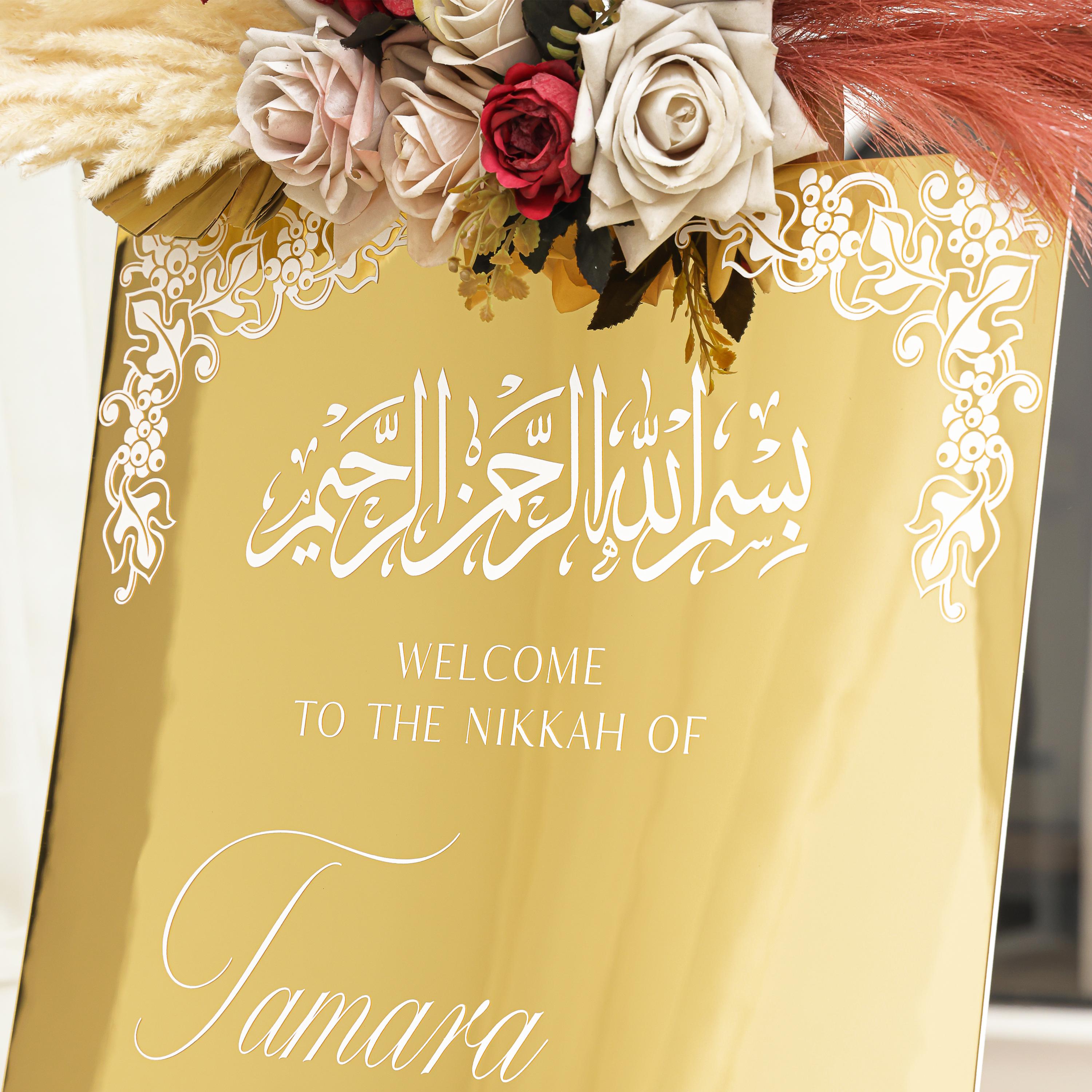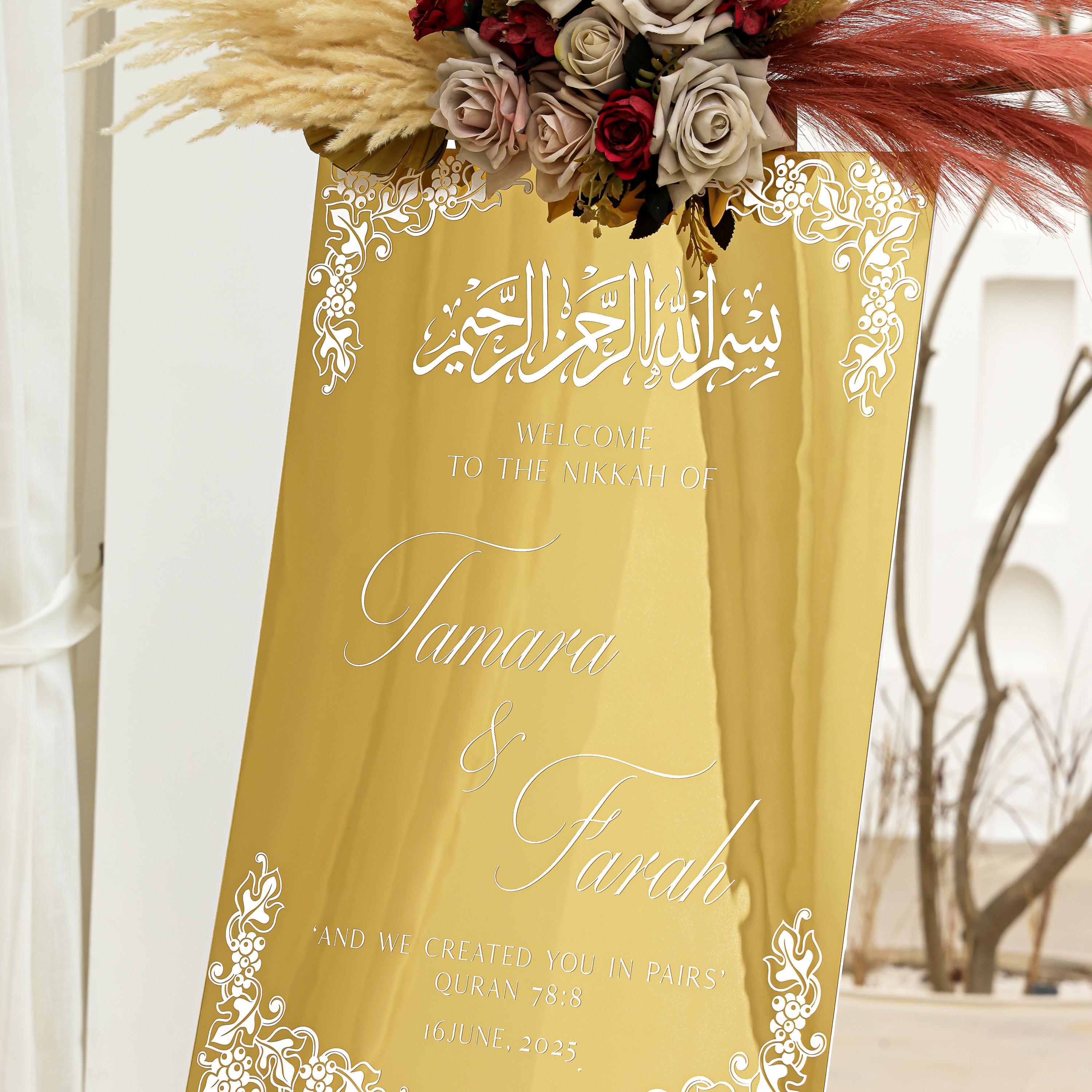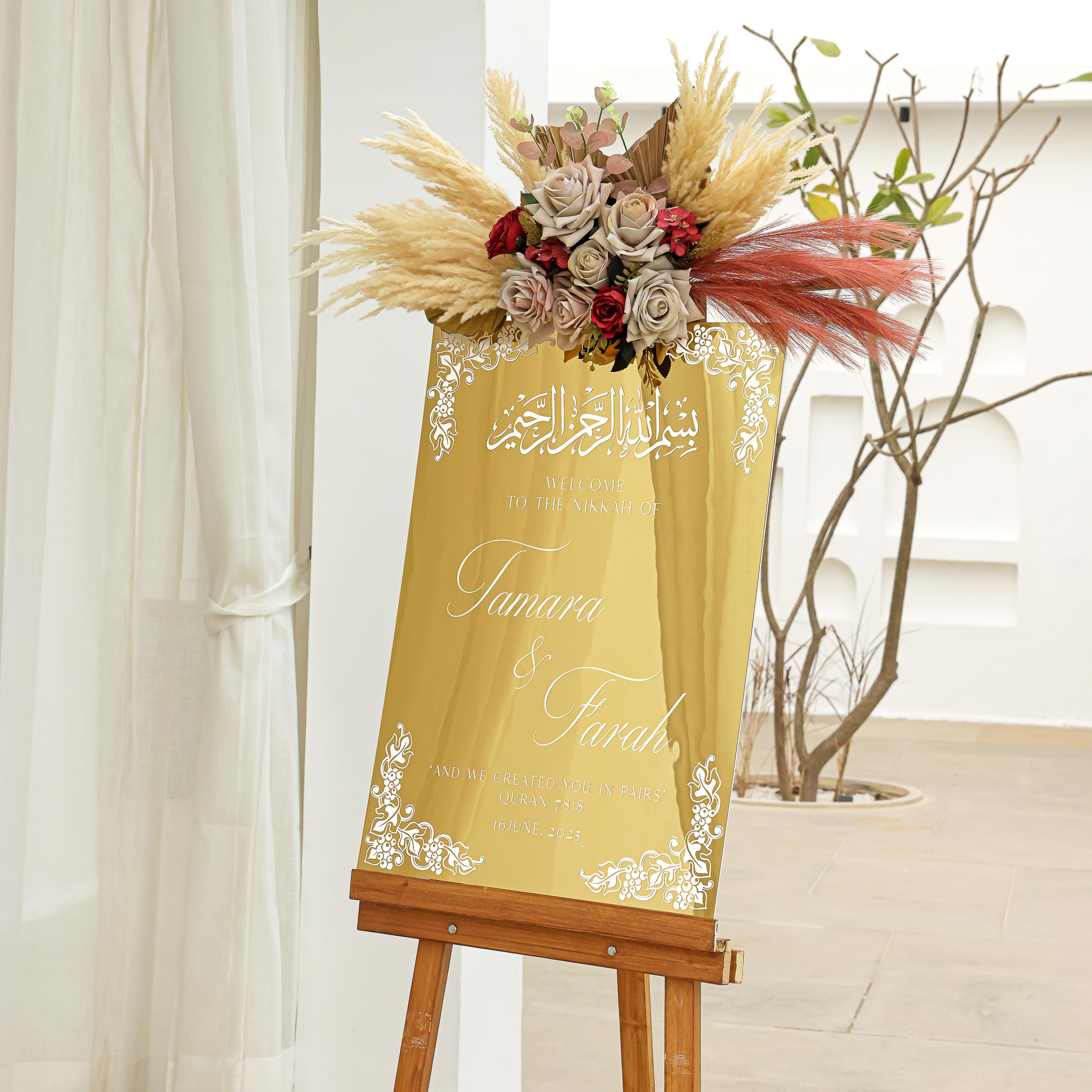 Our modern Arabic wedding welcome signs are crafted from high-quality Mirror Gold acrylic. The lettering is done using UV printing, ensuring a long-lasting, luxurious finish. Unlike other signs that use vinyl or stickers.