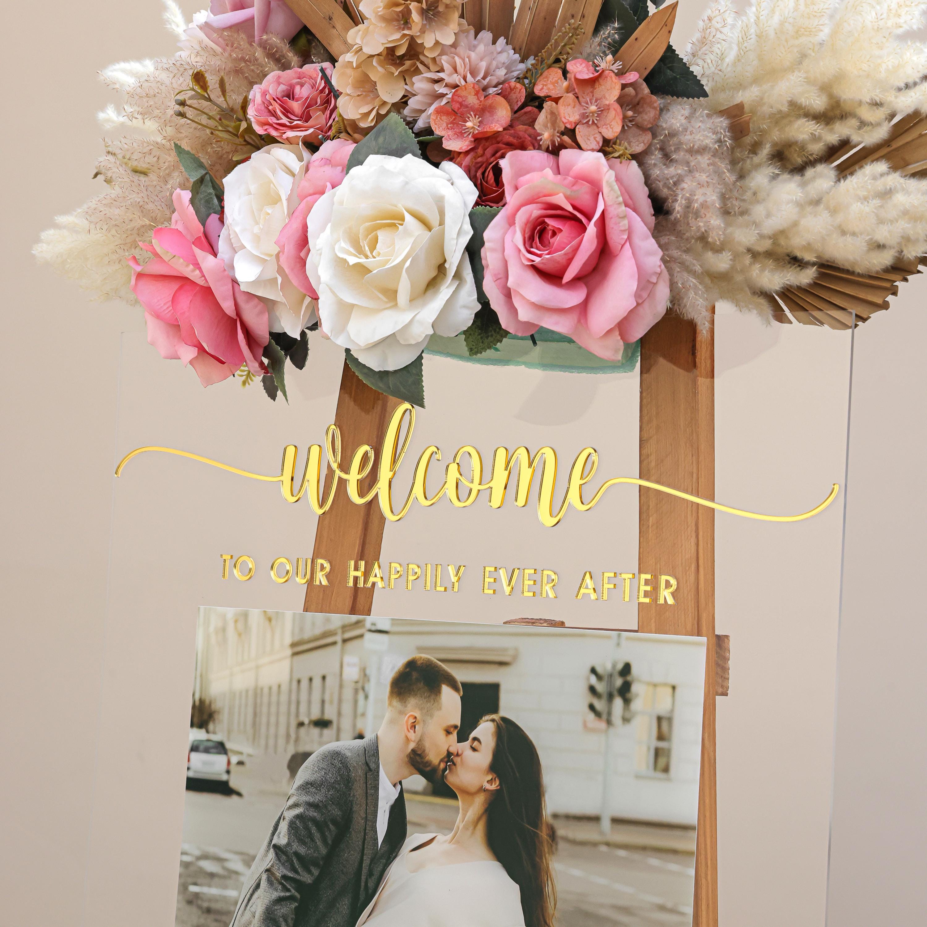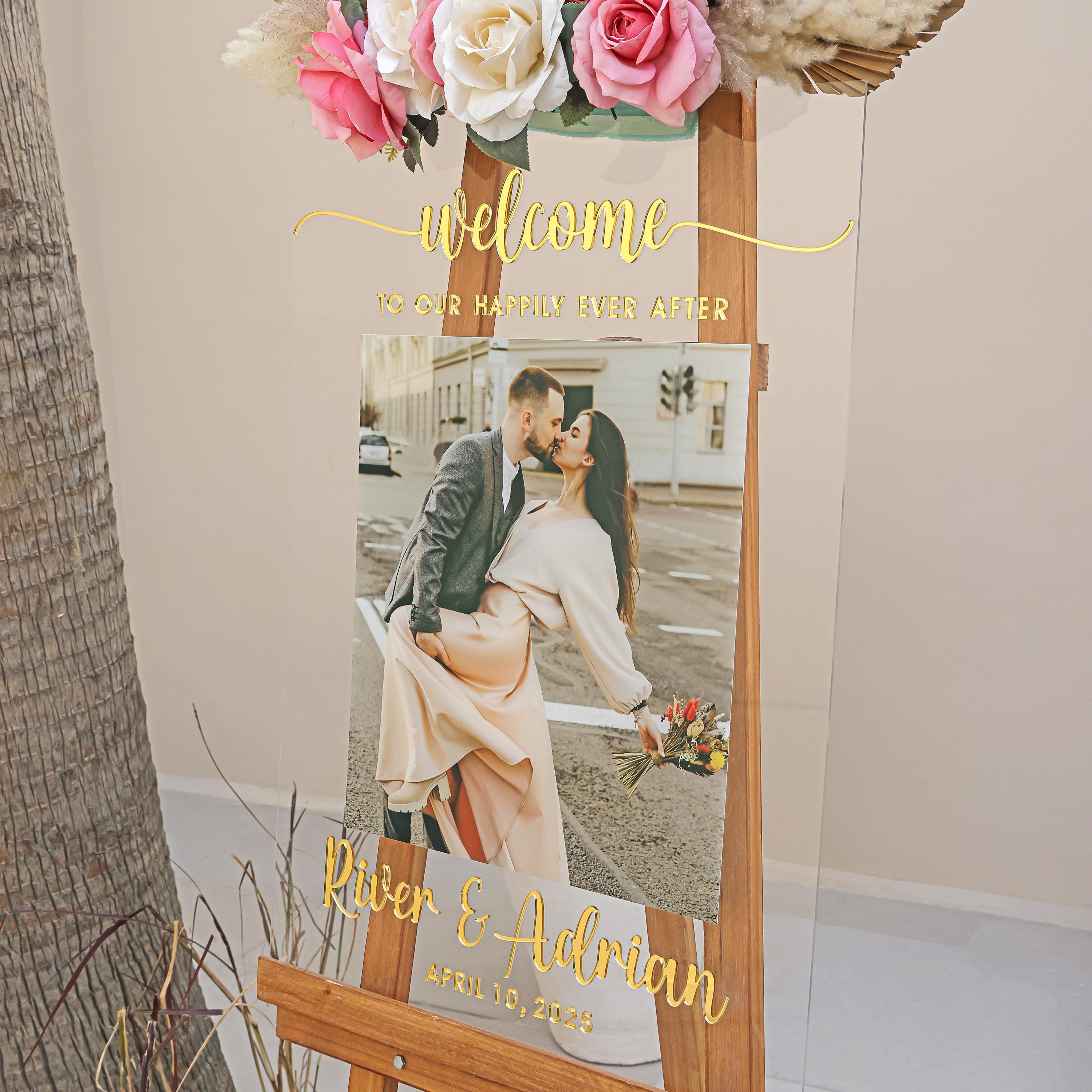 Personalized 3D Letters Photo Welcome signs are a beautiful Wedding décor to welcome your guest. This modern wedding welcome sign is made out of acrylic sheet. The lettering is of high quality Mirror gold acrylic and photo is UV printed to make it more beautiful and long lasting. We do not use vinyl or stickers.