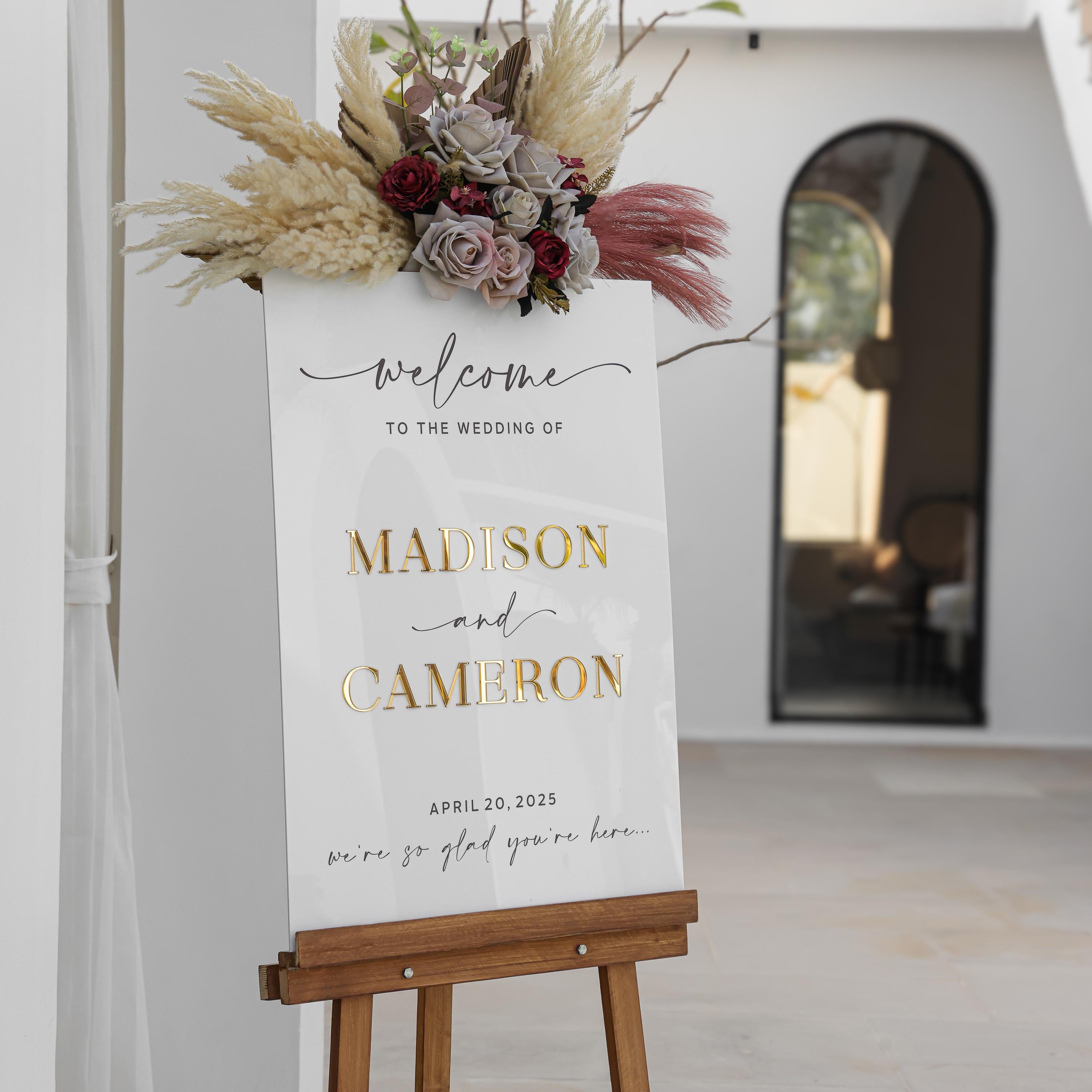 Our modern wedding welcome signs are crafted from high-quality white acrylic. The lettering is made from premium mirror gold acrylic, ensuring a long-lasting, luxurious finish. Unlike other signs that use vinyl or stickers, all of our letters are carefully raised using laser-cut acrylic to ensure precision and elegance.