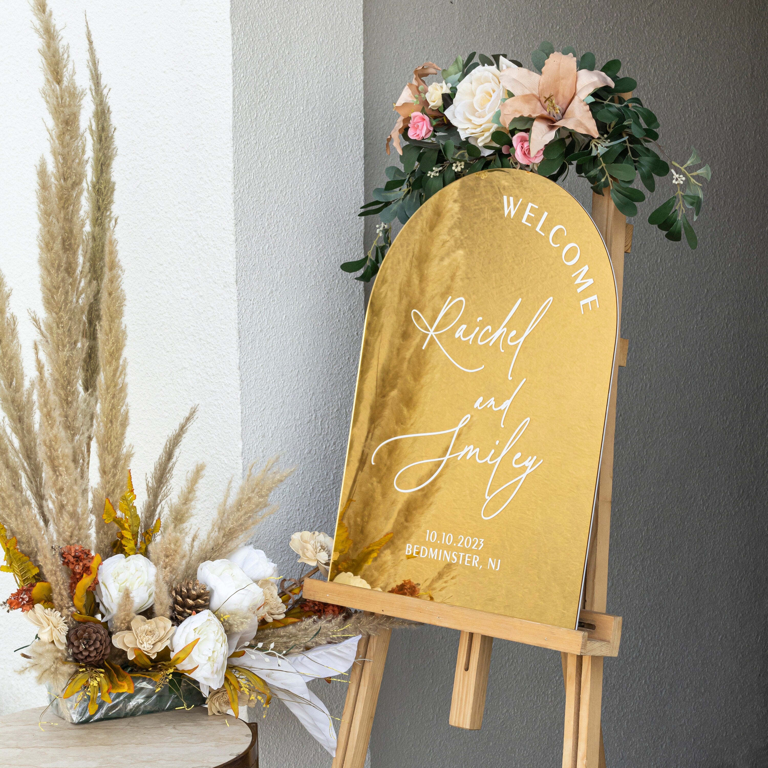 Personalized Welcome signs are a beautiful Wedding décor to welcome your guest. This modern wedding welcome sign is made out of Mirror Gold acrylic sheet. The lettering is done using UV printing machine to make it more beautiful and long lasting. We do not use vinyl or stickers.