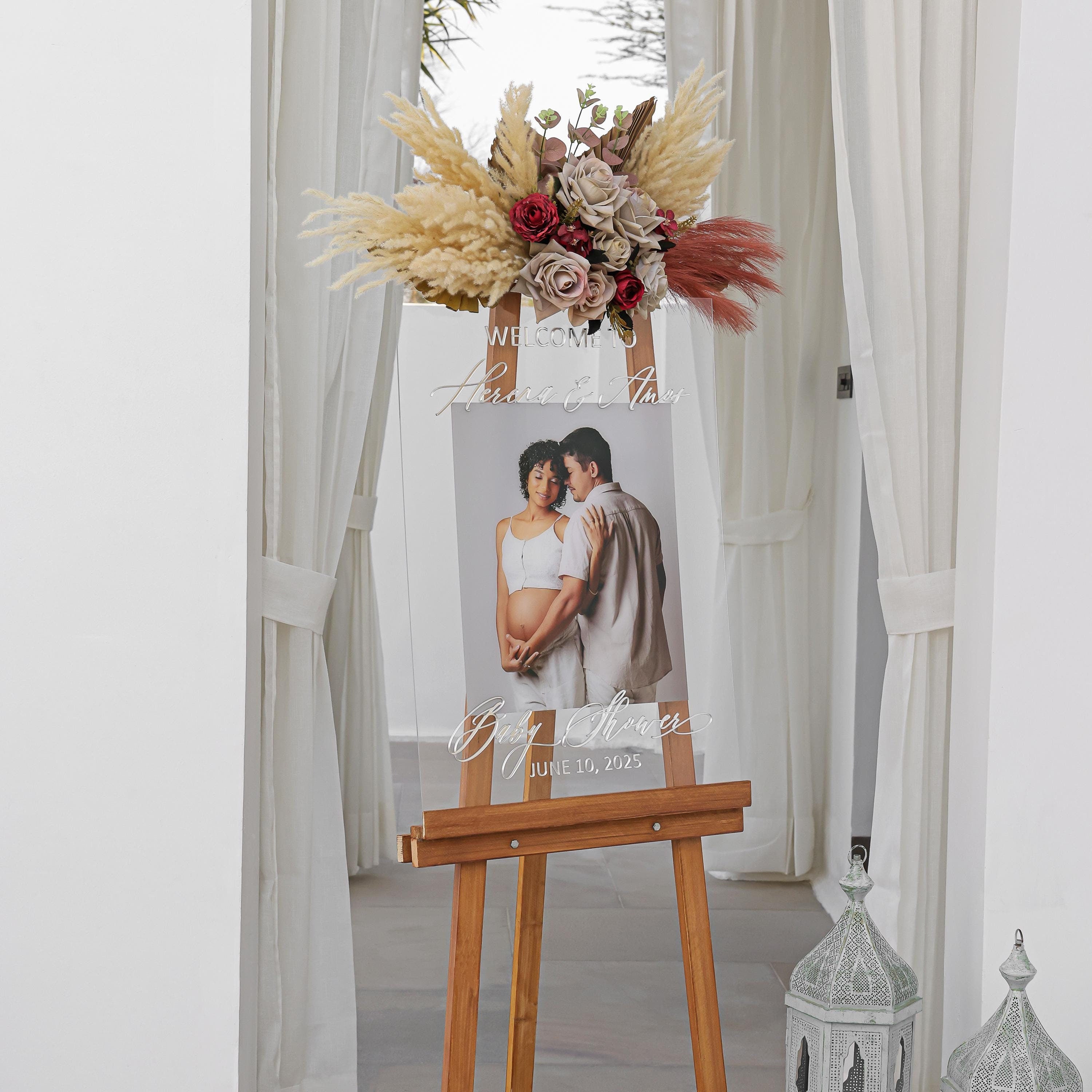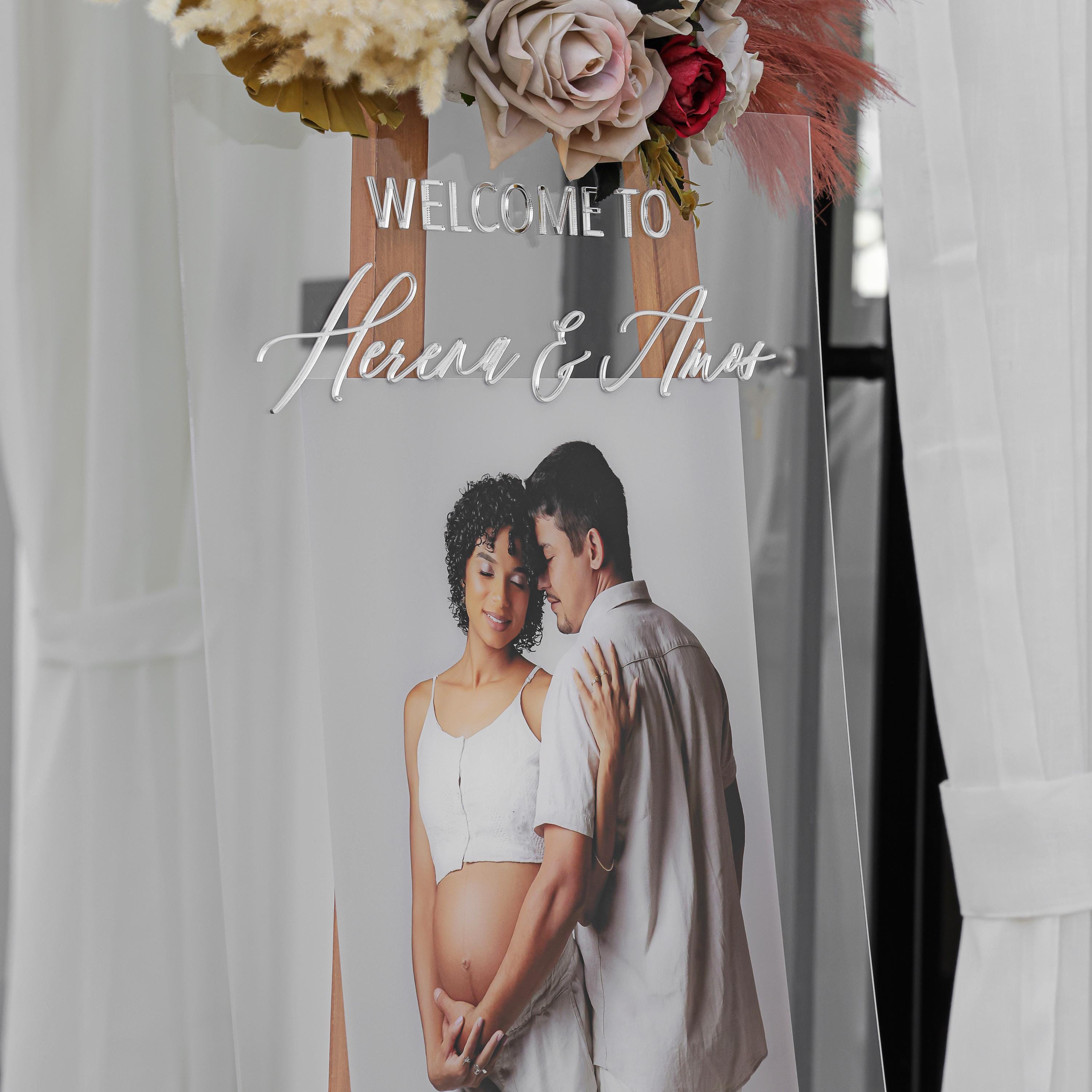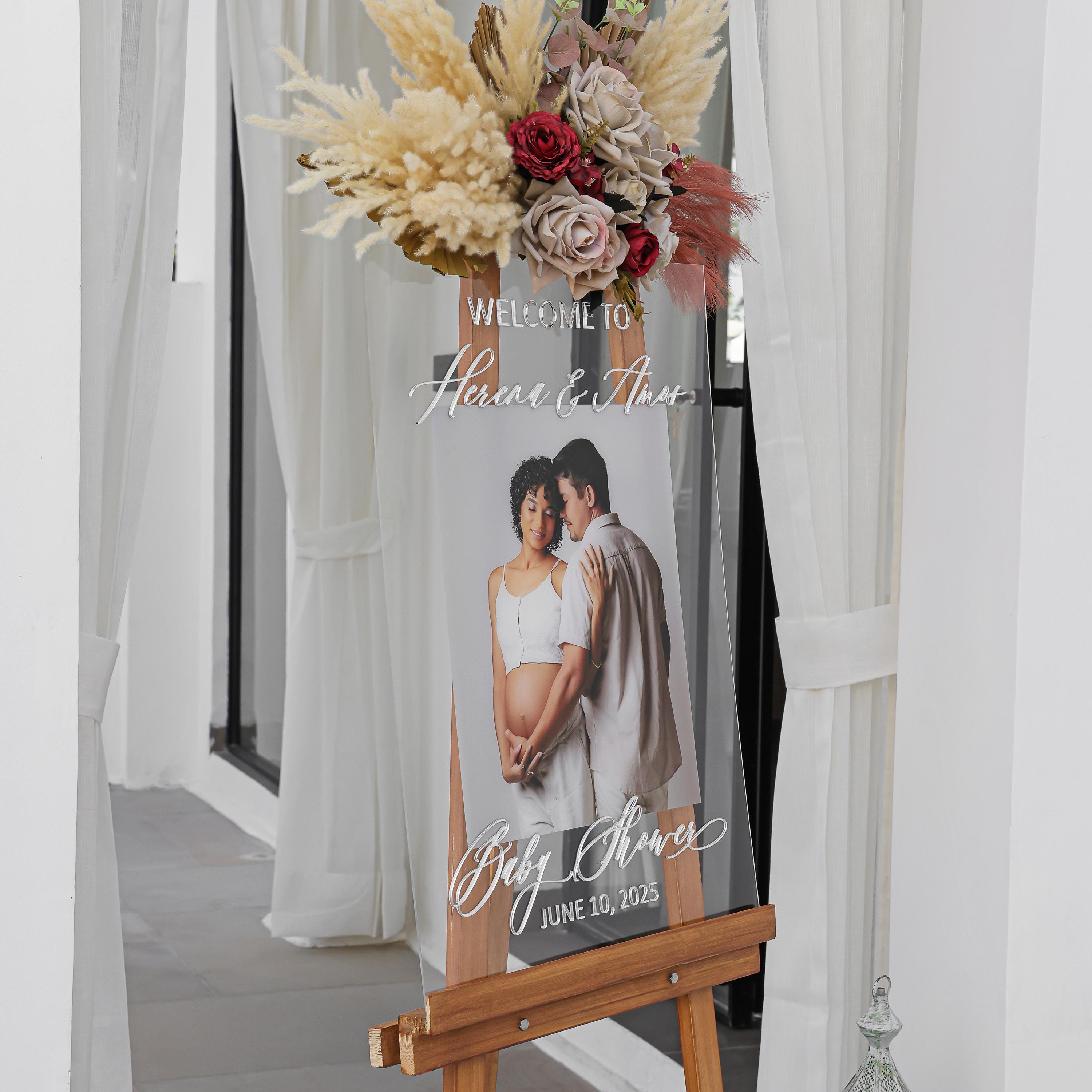 This modern photo baby shower welcome sign is crafted from high-quality Clear acrylic. The lettering is raised using 3D Mirror Silver acrylic sheet, and your photo is UV printed, ensuring a long-lasting, luxurious finish. Unlike other signs that use vinyl or stickers, our signs maintain superior quality and elegance.