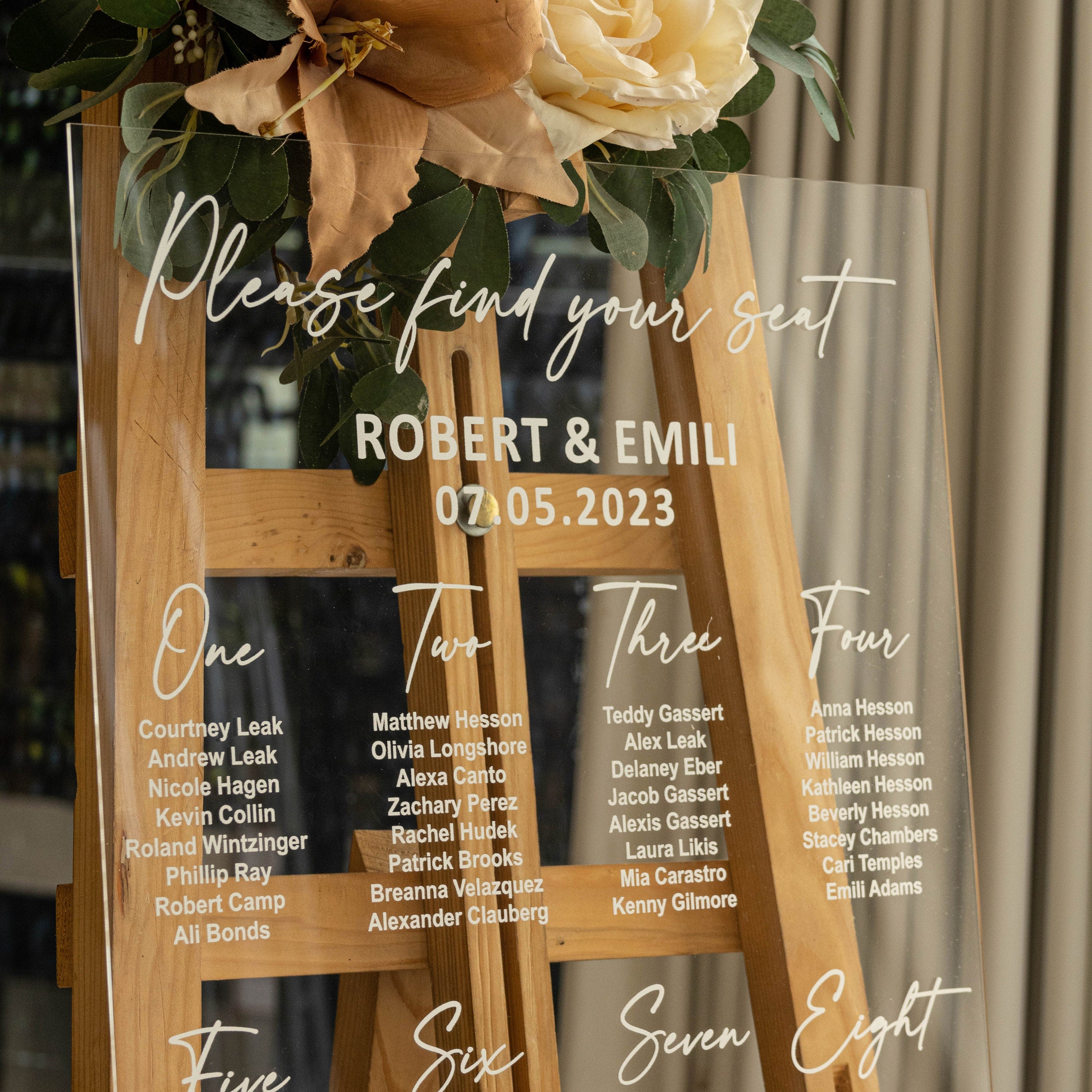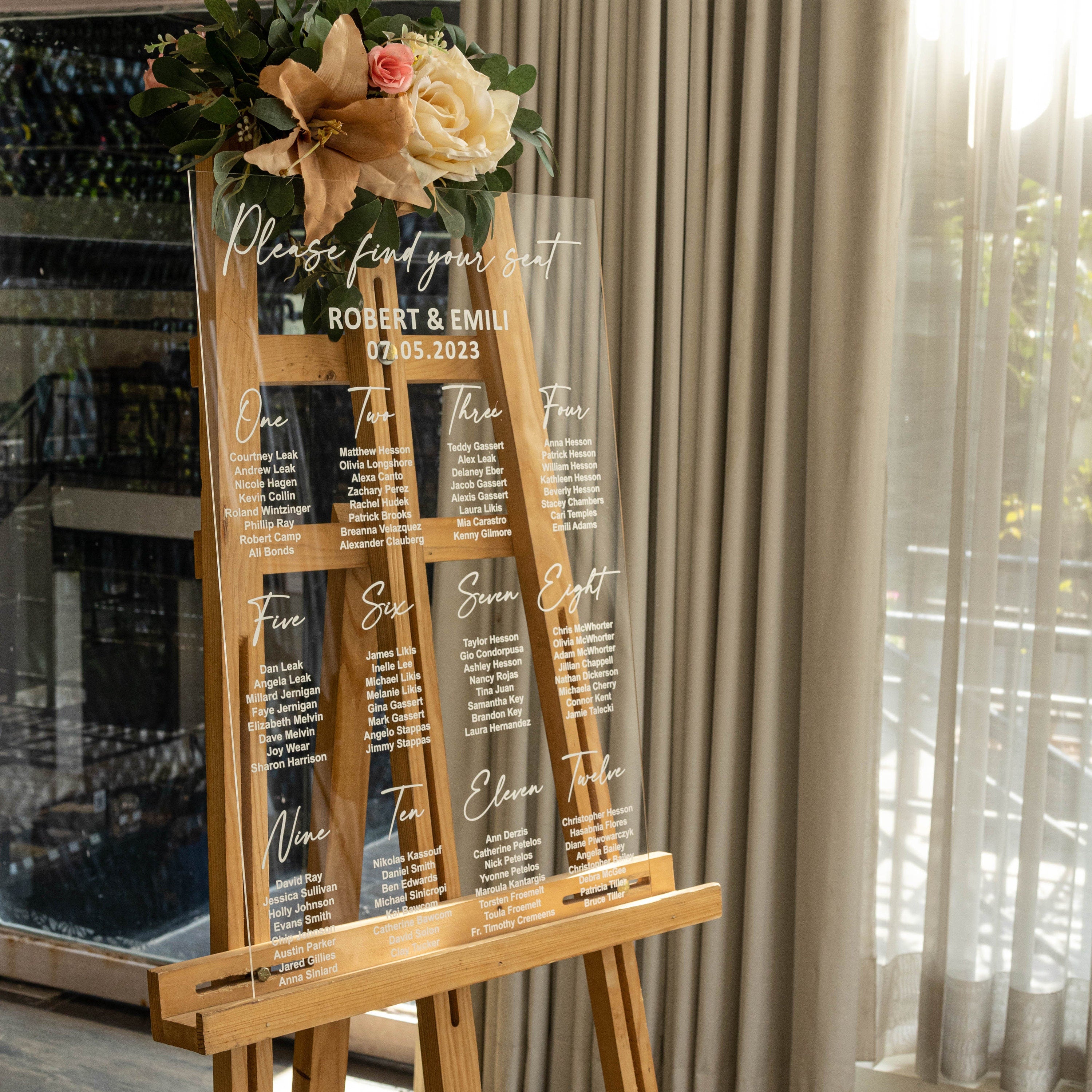 Personalized Acrylic UV Printed Seating Chart are a beautiful Wedding décor to welcome your guest. This modern wedding Seating Chart is made out of acrylic sheet. We use UV Printing for best durability. * WE DO NOT USE VINYLS OR STICKERS.