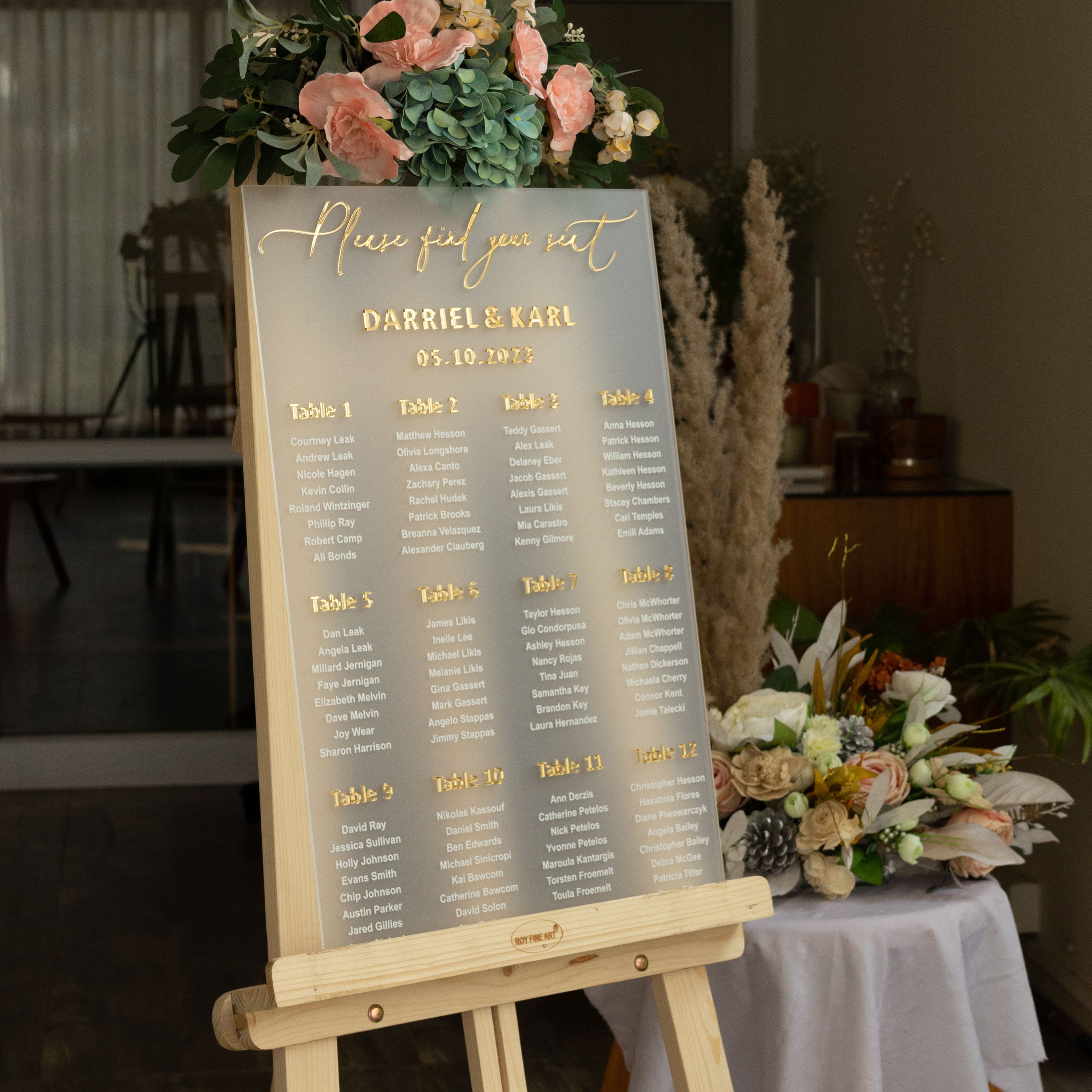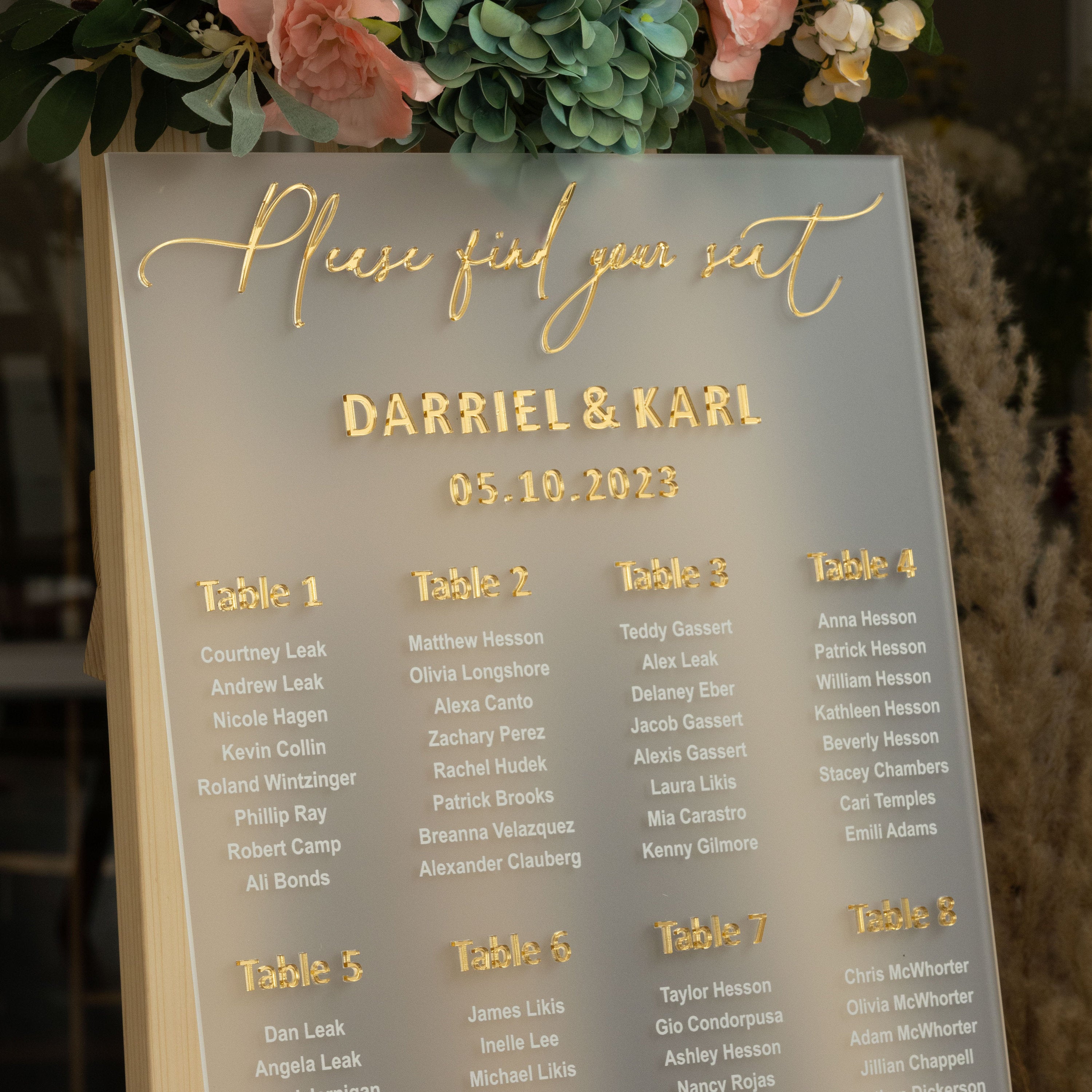 Personalized Acrylic 3D headings and names UV Printed Seating Chart are a beautiful Wedding décor to welcome your guest. This modern wedding Seating Chart is made out of acrylic sheet. We use UV Printing for best durability. * WE DO NOT USE VINYLS OR STICKERS.