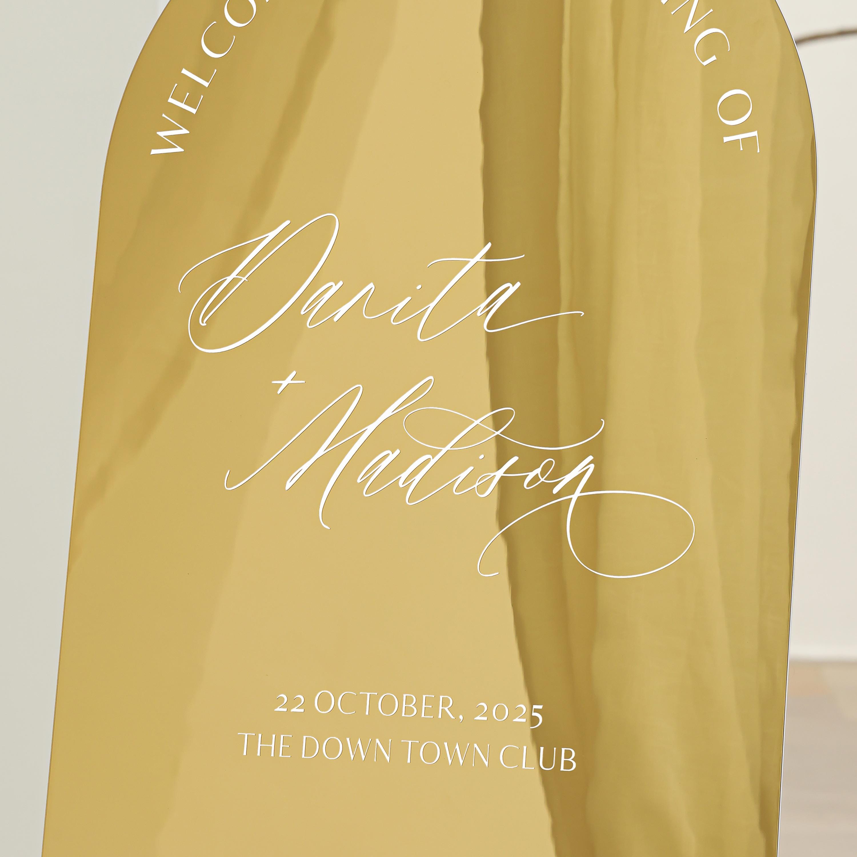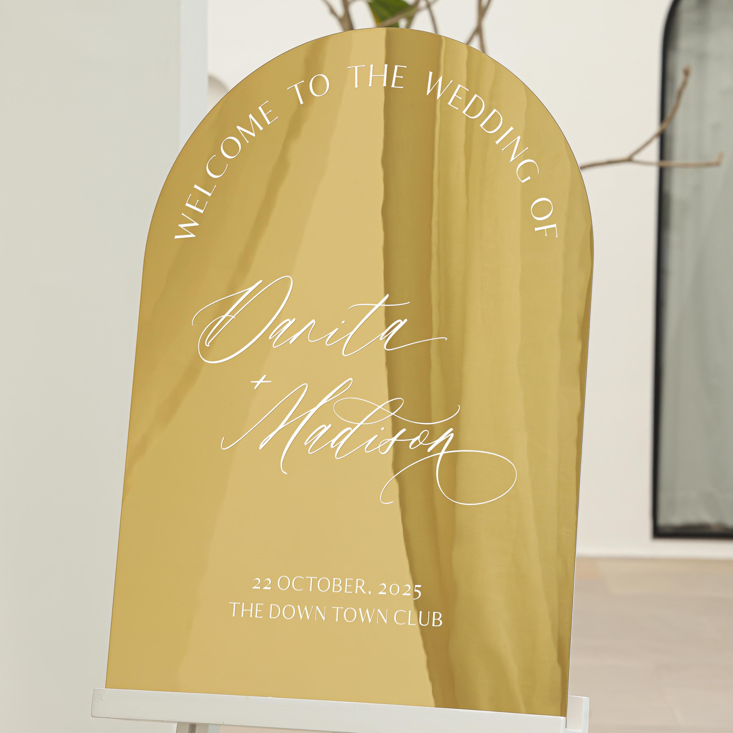 This modern wedding welcome signs is crafted from high-quality Mirror Gold acrylic. The lettering is done using UV Printer, ensuring a long-lasting, luxurious finish. Unlike other signs that use vinyl or stickers.