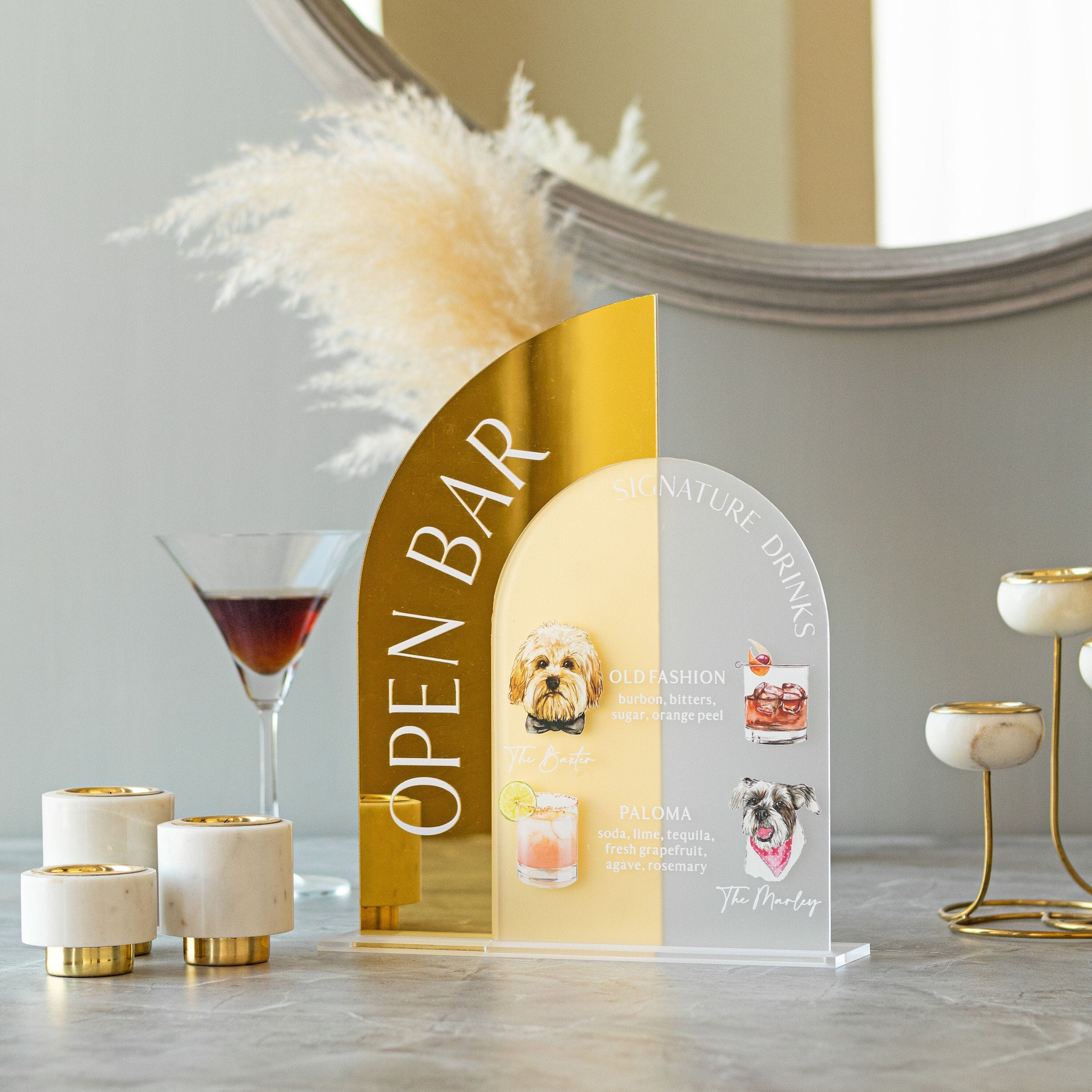Gold Mirror Frosted Acrylic Bar Sign, Open Bar Wedding Sign, His and Hers Drinks Sign, Gold Mirror Signature Drinks Sign, Wedding Bar Sign, Wedding Bar Menu, Arch Shape Drinks Menu,