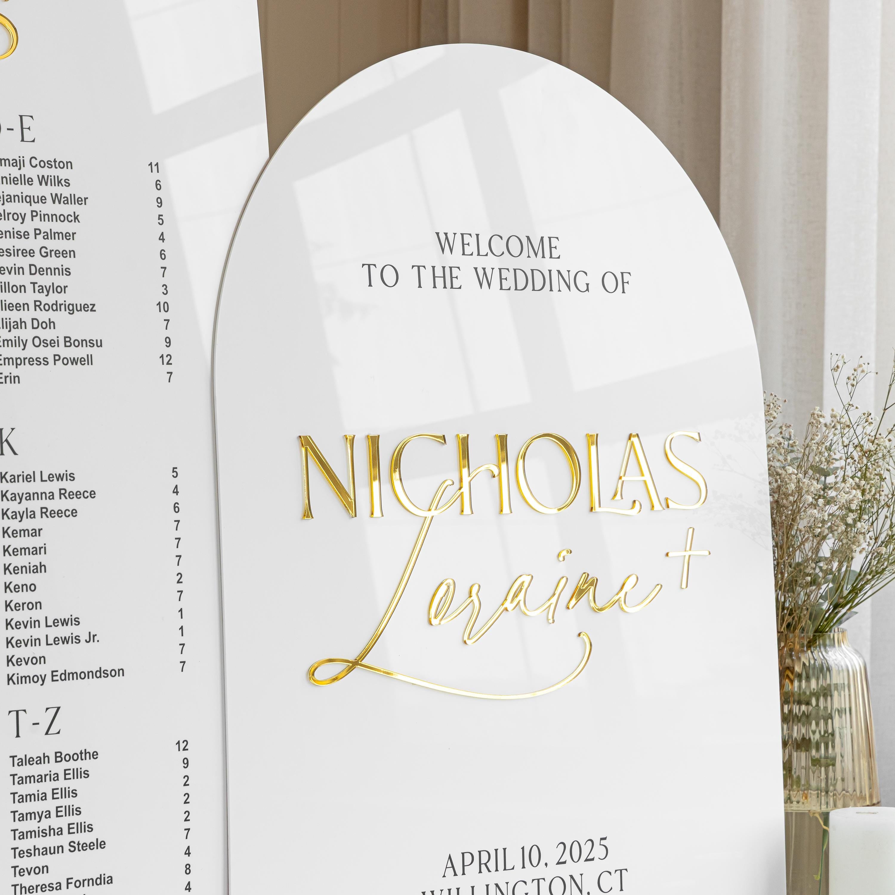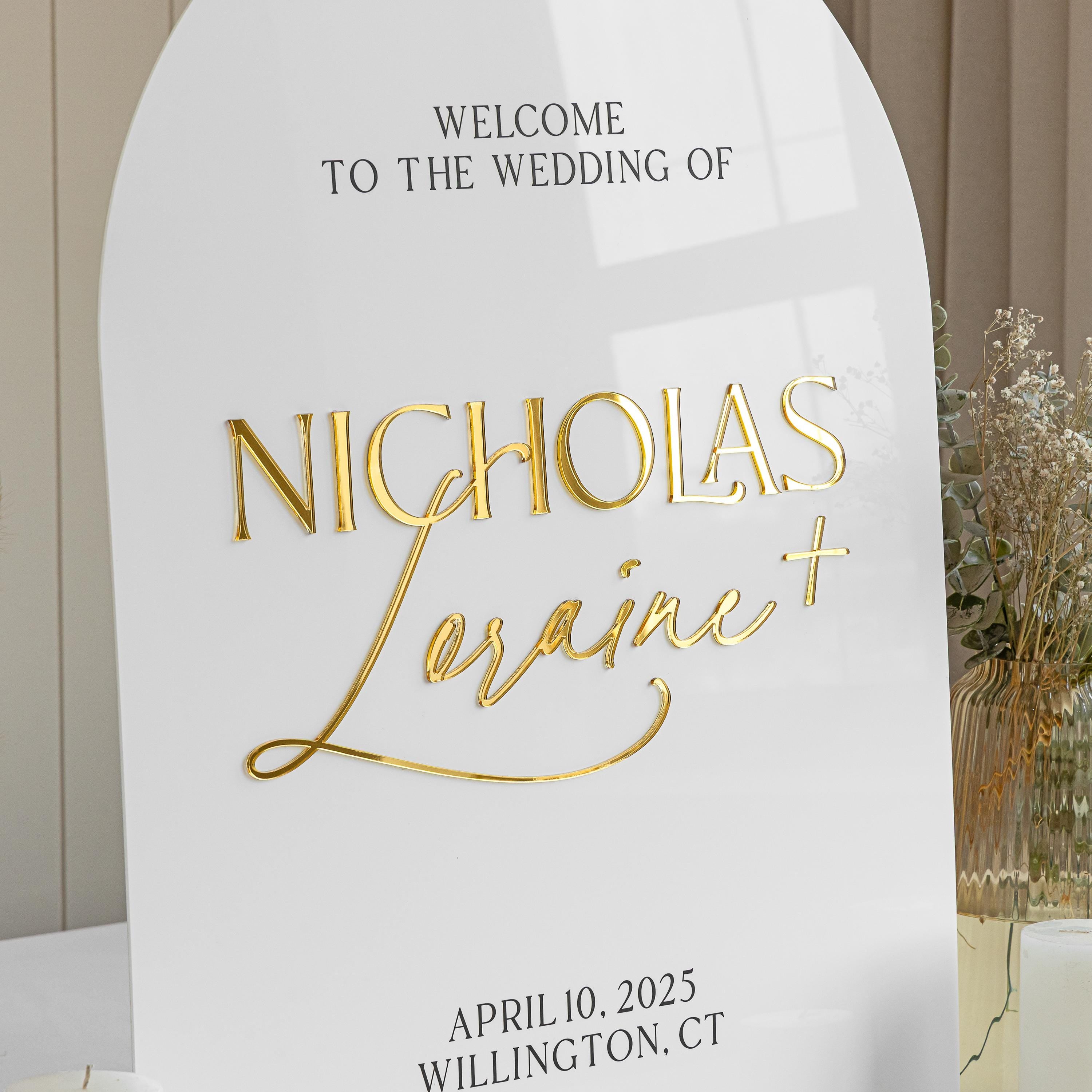 Our modern wedding welcome signs are crafted from high-quality white acrylic. The lettering is made from premium mirror gold acrylic, ensuring a long-lasting, luxurious finish. Unlike other signs that use vinyl or stickers, all of our letters are carefully raised using laser-cut acrylic to ensure precision and elegance.
