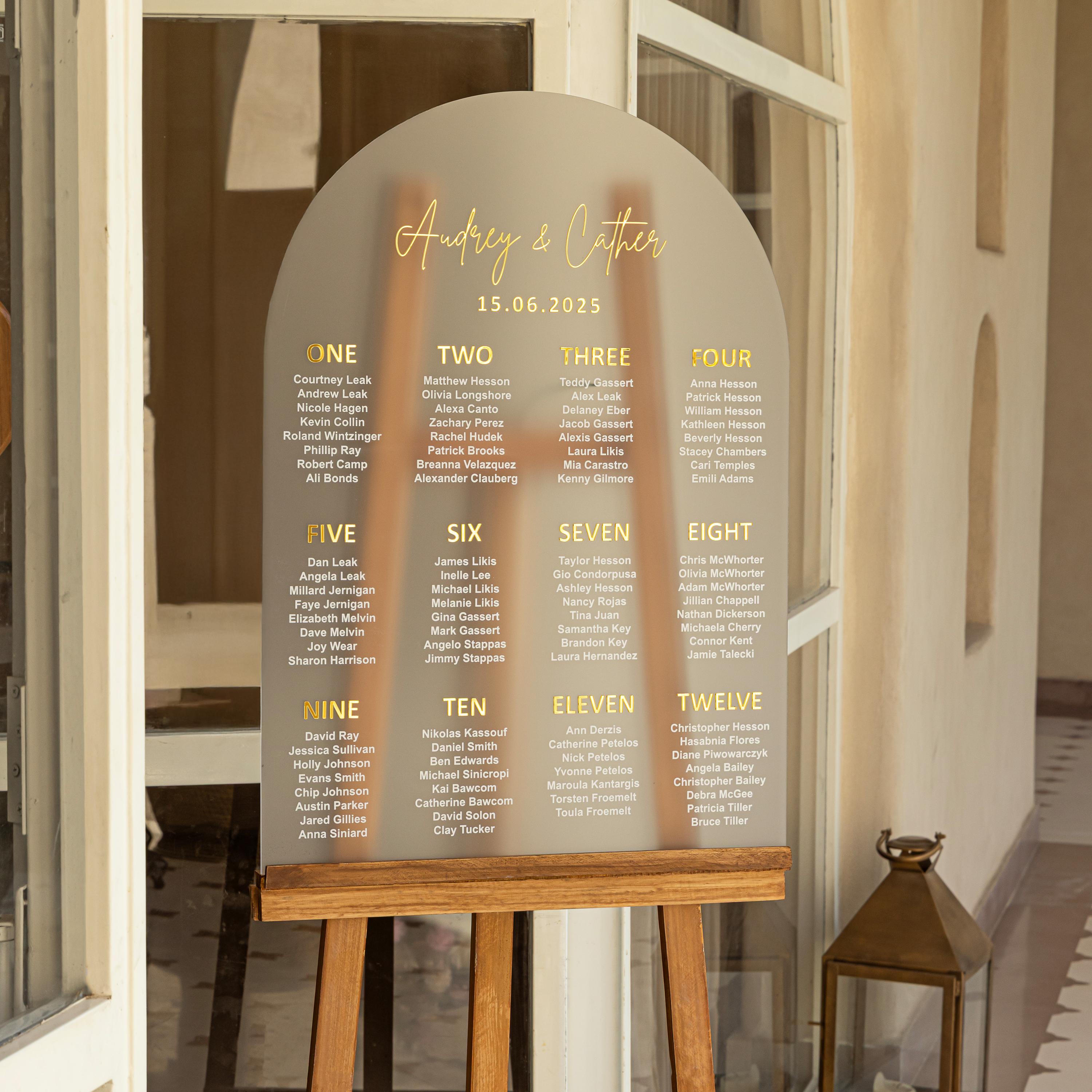 This elegant wedding seating chart is the perfect way to welcome your guests. Crafted from high-quality acrylic, it features personalized 3D headings and names all UV printed for superior durability. We do not use vinyl or stickers, ensuring a sleek and long-lasting finish.