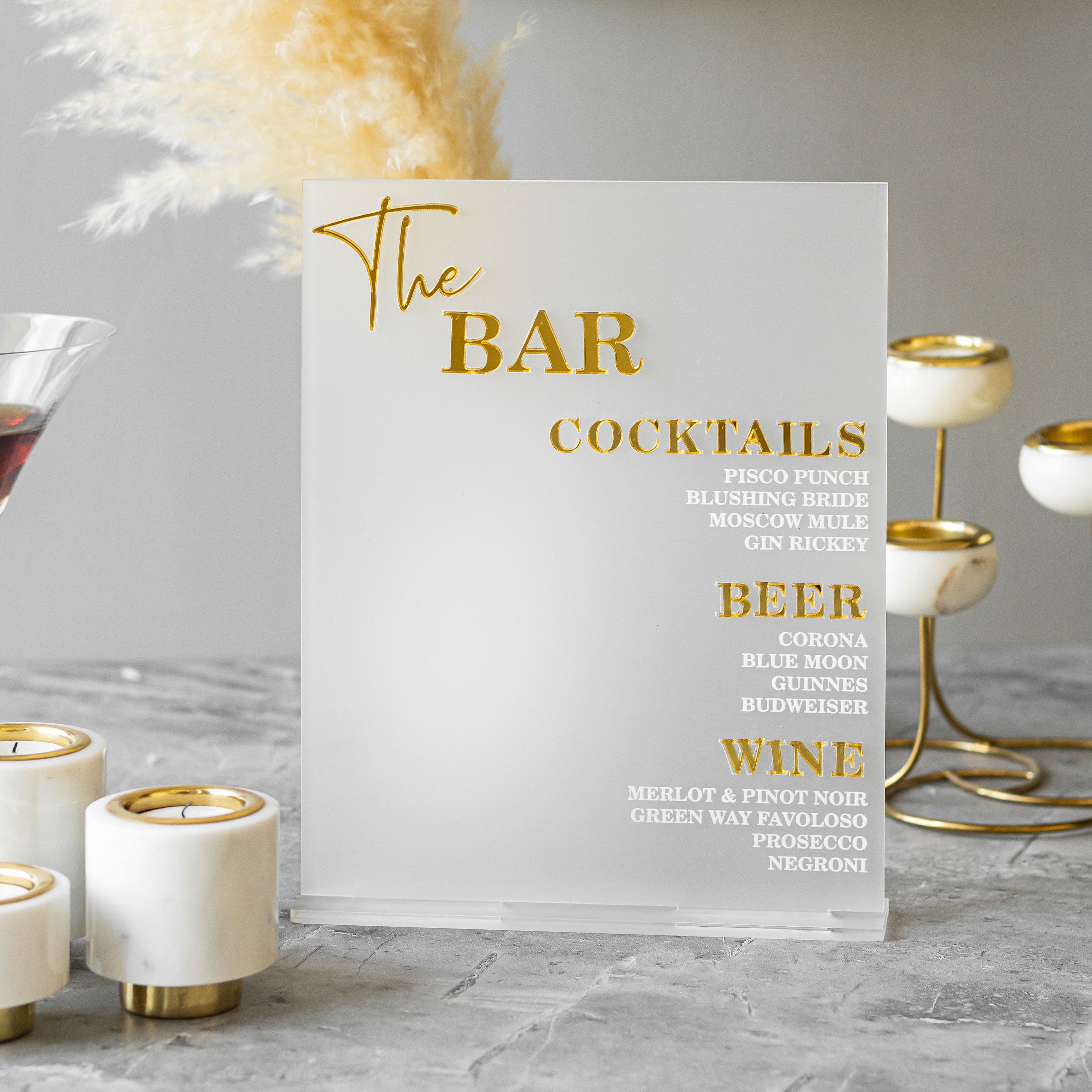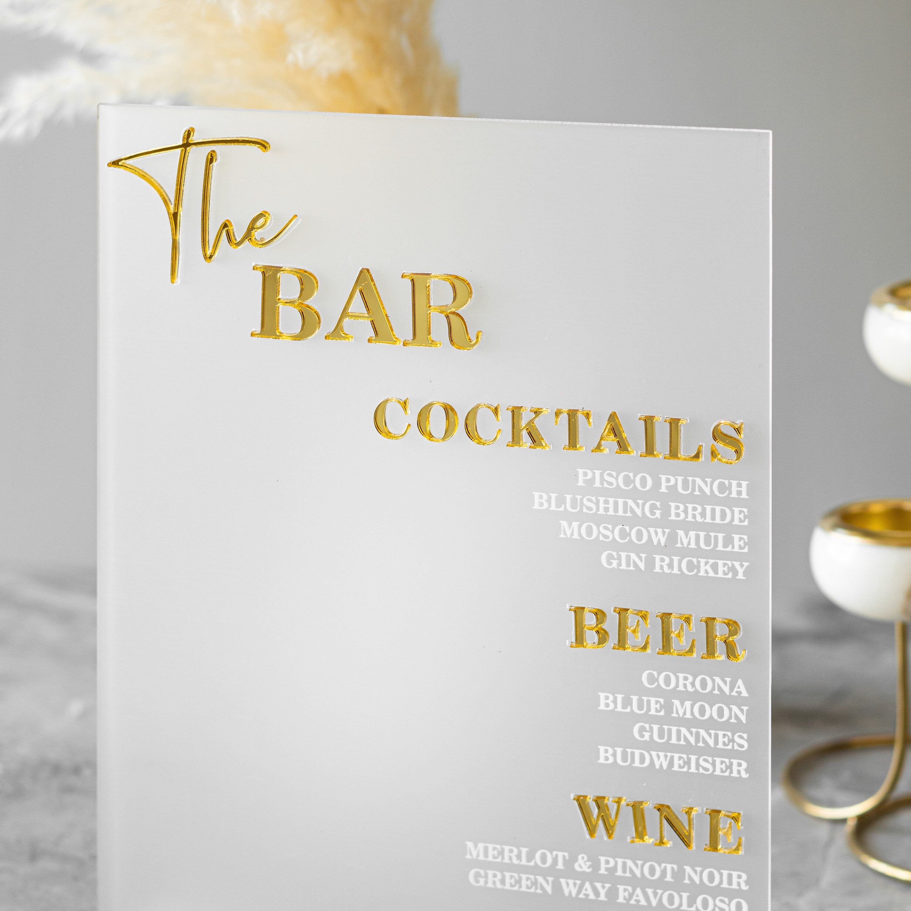 Introducing our exquisite Wedding Frosted and Mirror Gold Acrylic Bar Sign, a perfect blend of elegance and modern charm. Handcrafted with meticulous attention to detail, this stunning sign will elevate your wedding bar decor, adding a touch of sophistication to your special day.