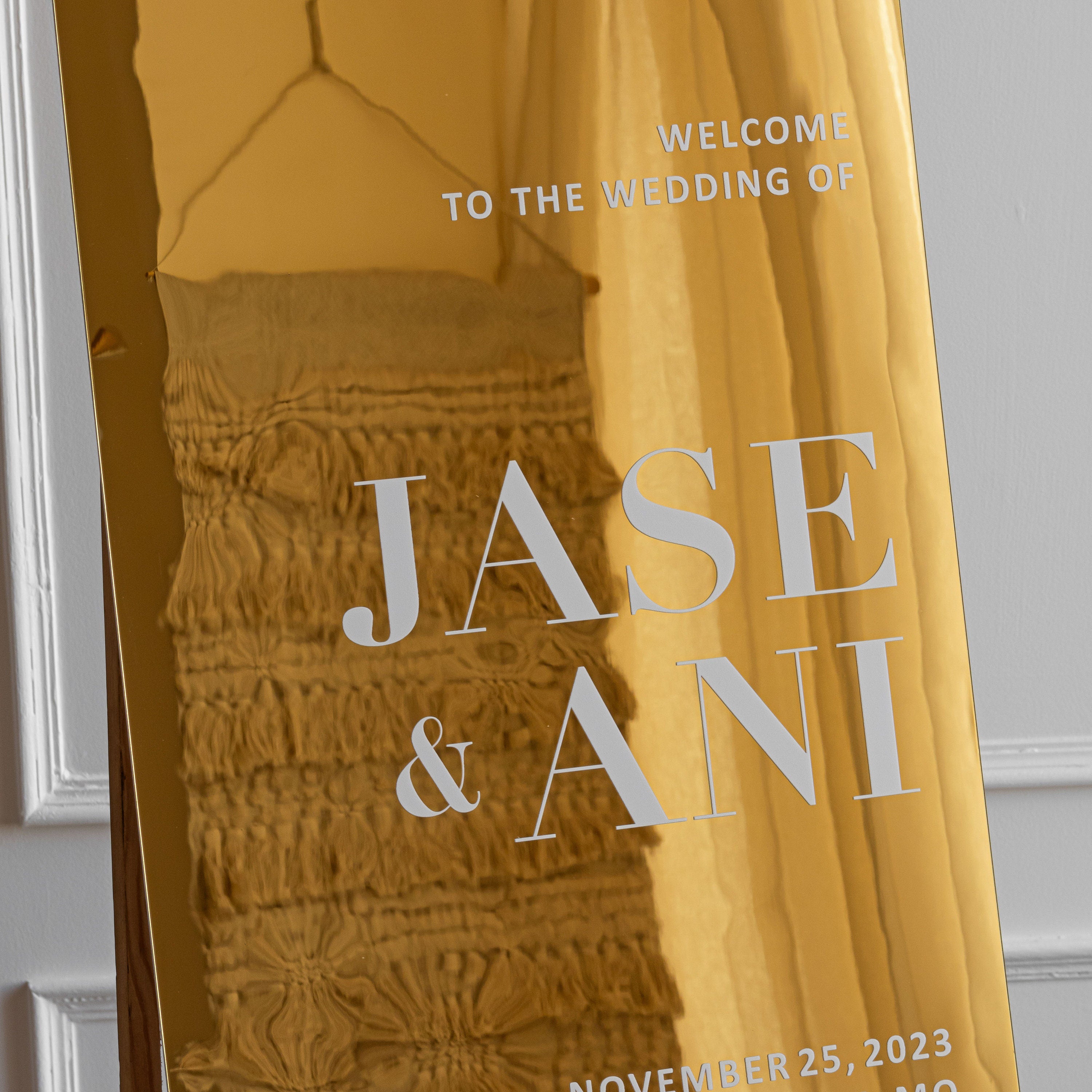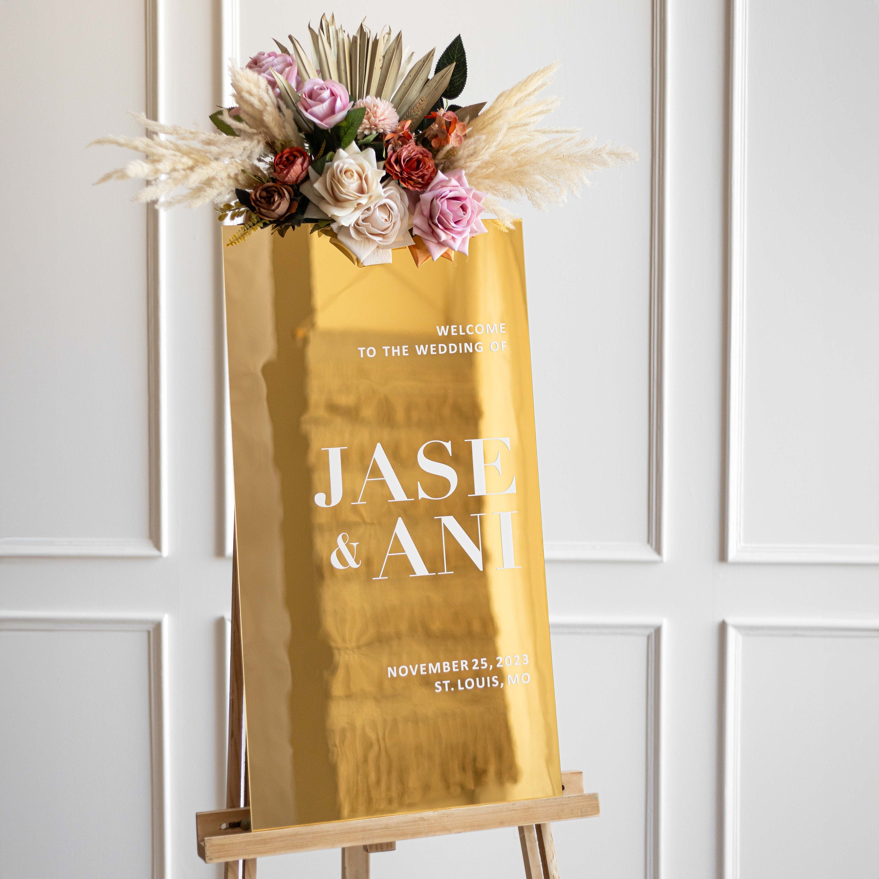 Personalized Welcome signs are a beautiful Wedding décor to welcome your guest. This modern wedding welcome sign is made out of Mirror Gold acrylic sheet. The lettering is done using UV printing machine to make it more beautiful and long lasting. We do not use vinyl or stickers.