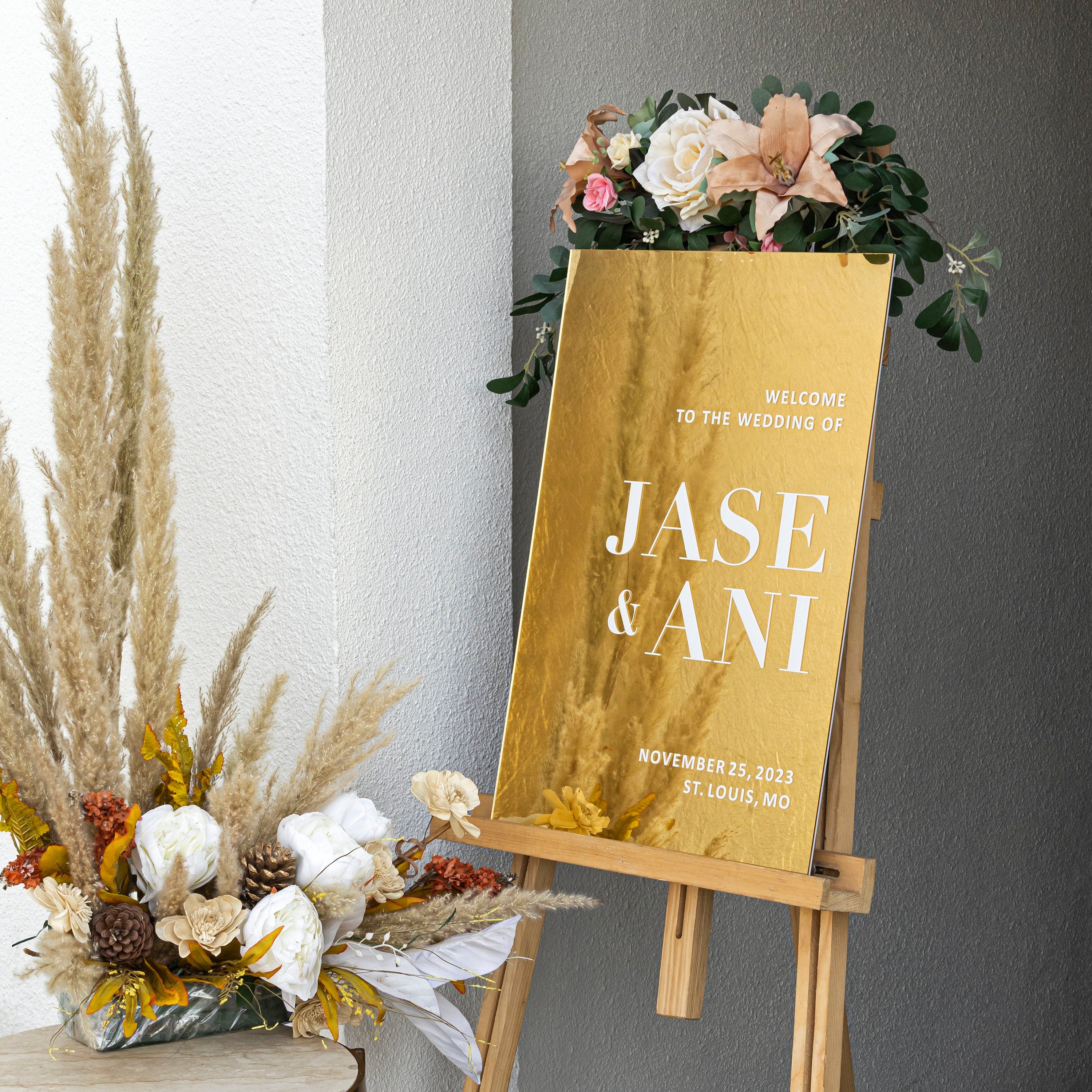 Personalized Welcome signs are a beautiful Wedding décor to welcome your guest. This modern wedding welcome sign is made out of Mirror Gold acrylic sheet. The lettering is done using UV printing machine to make it more beautiful and long lasting. We do not use vinyl or stickers.