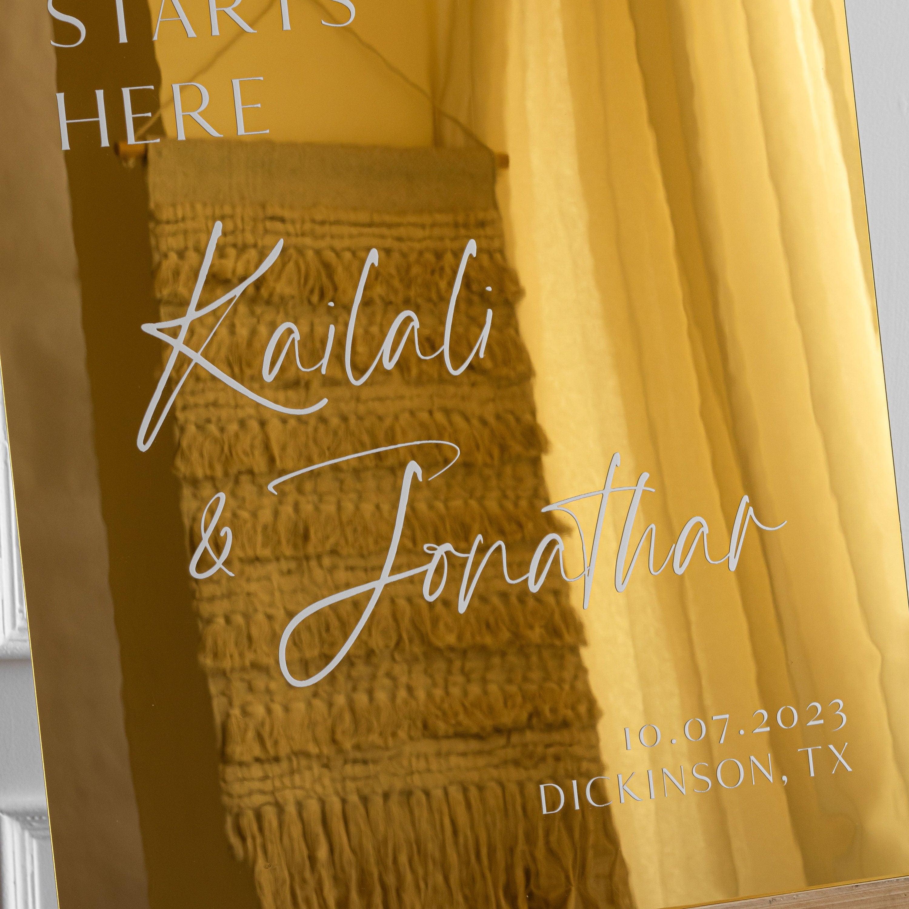 This modern Wedding signs is made out of Mirror Gold acrylic sheet. The lettering is done using UV printing machine to make it more beautiful and long lasting.