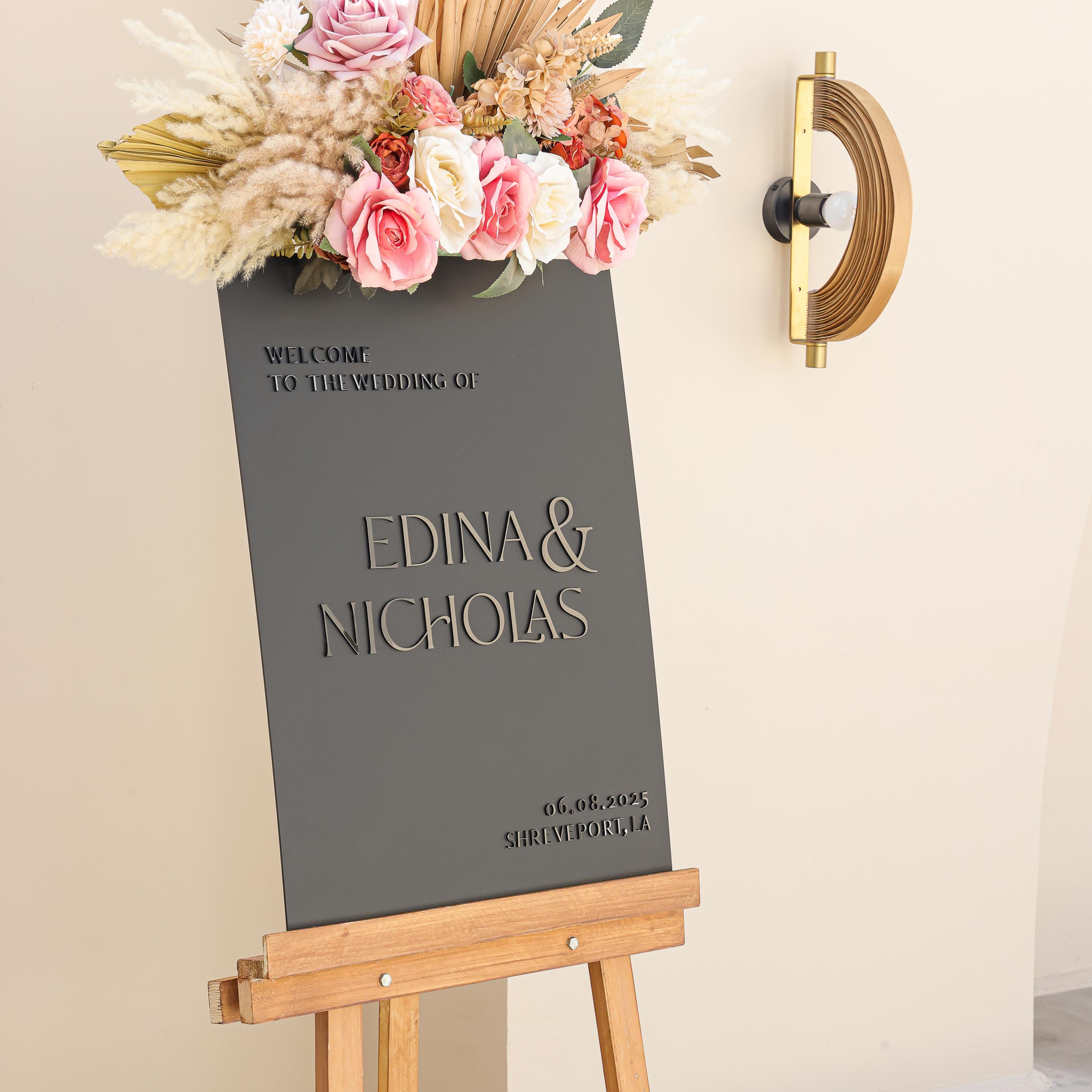Make a lasting impression with our Personalized 3D Wedding Welcome Sign – a perfect addition to your wedding entrance decor. Crafted from high-quality Matte Black acrylic, this custom wedding welcome sign features elegant, raised 3D lettering in Shinny Black Acrylic. We take pride in creating personalized wedding décor that is durable and long-lasting, without the use of vinyl or stickers. This custom acrylic wedding sign is the ideal choice to set the tone for your big day and is sure to impress.
