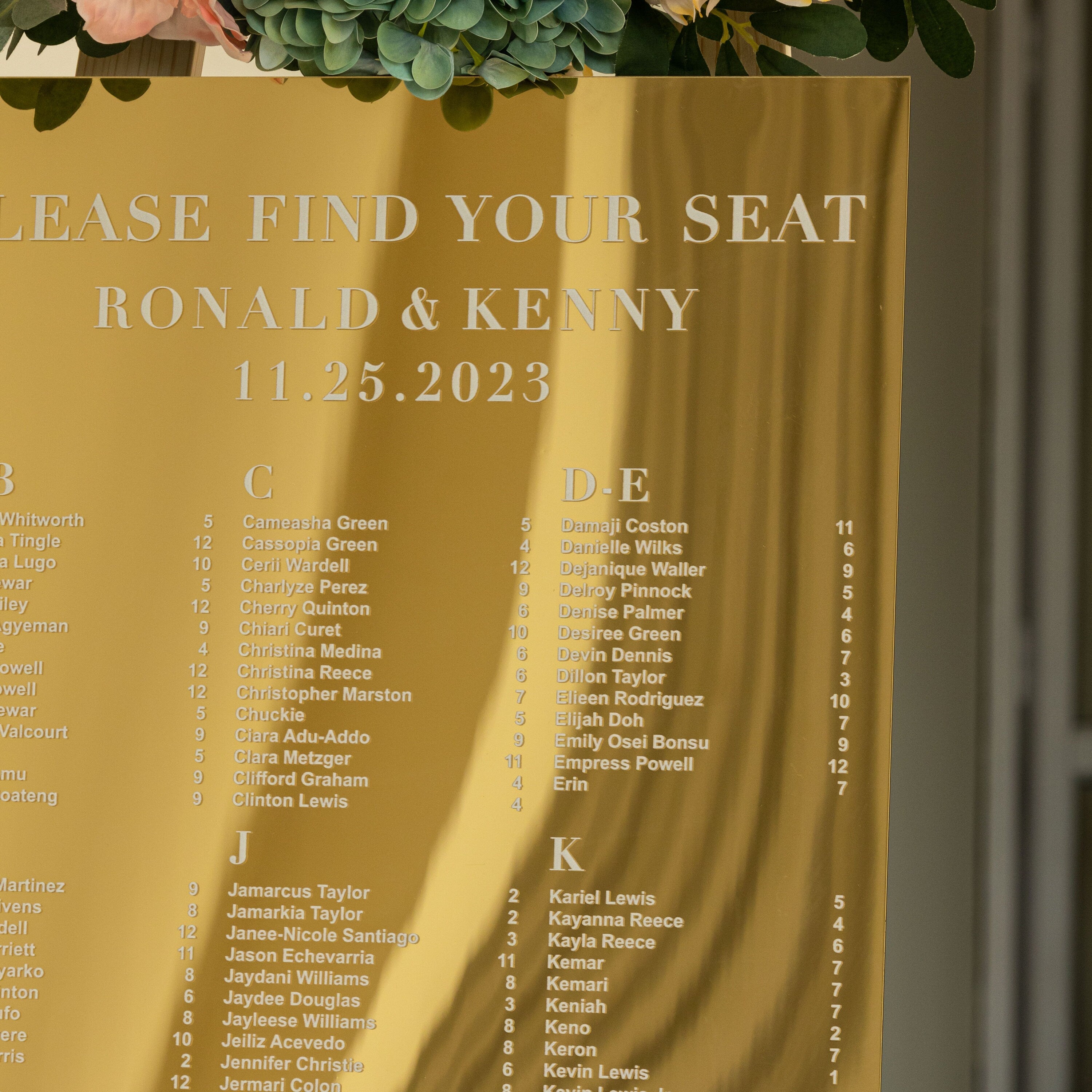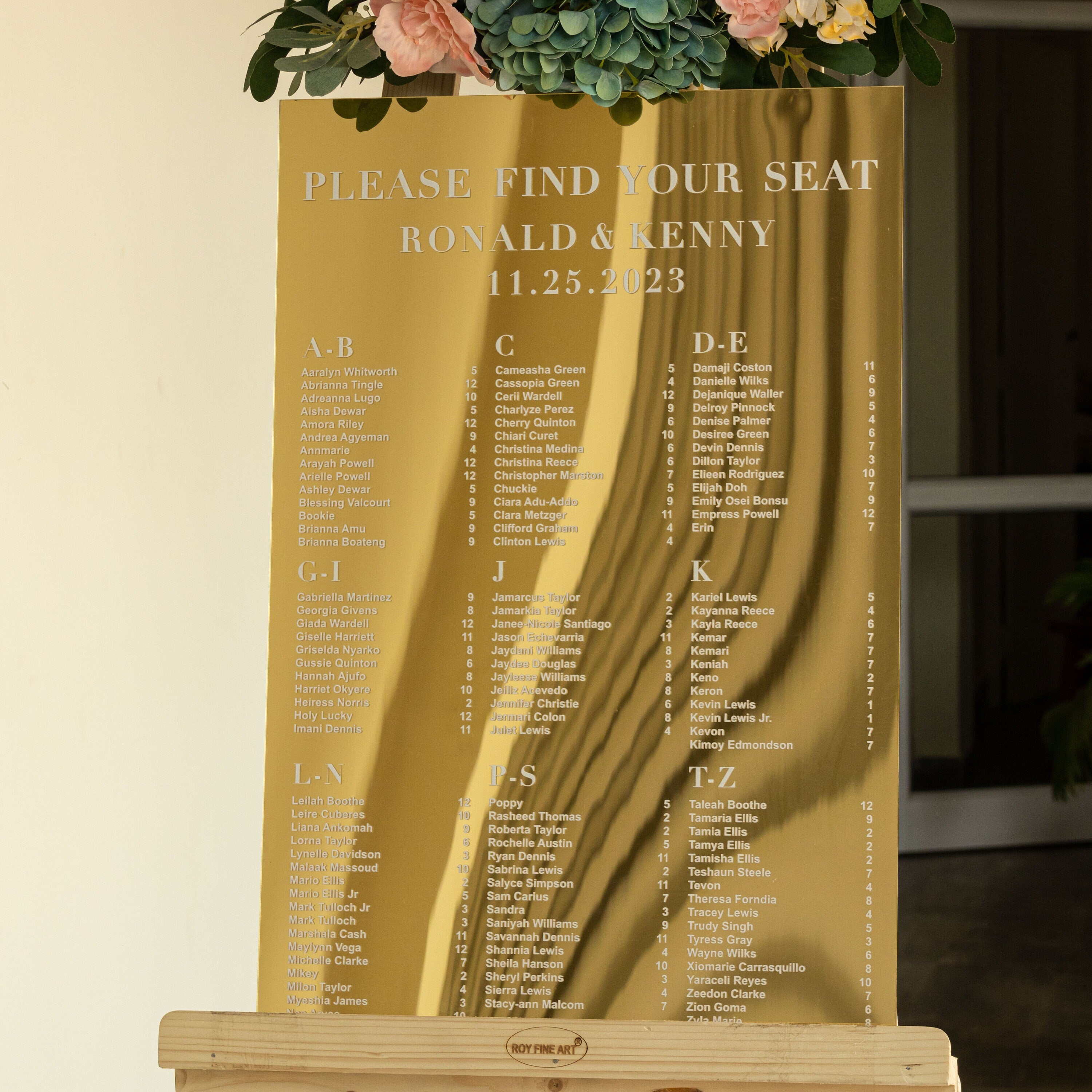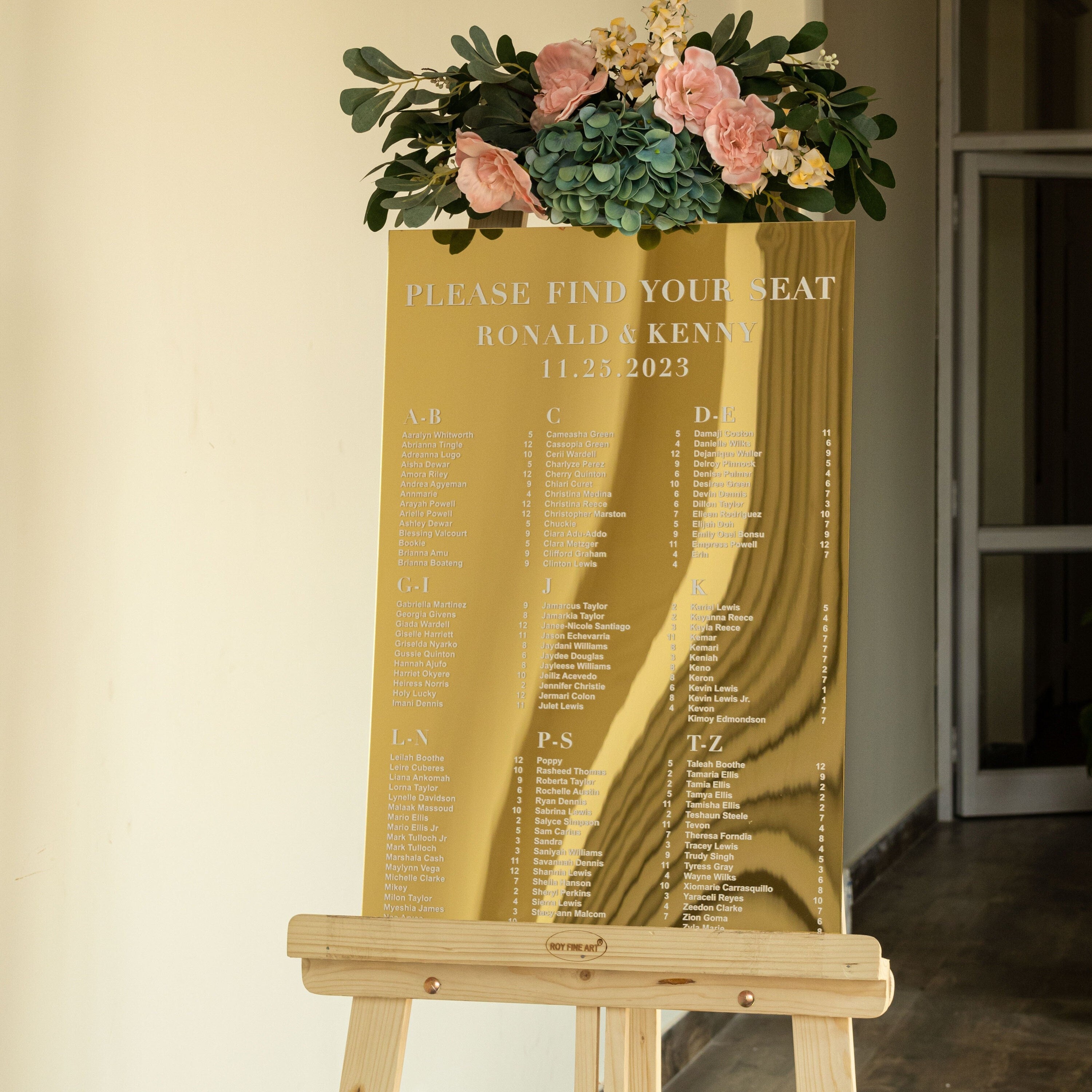 Personalized Acrylic UV Printed Seating Chart are a beautiful Wedding décor to welcome your guest. This modern wedding Seating Chart is made out of Mirror Gold acrylic sheet. We use UV Printing for best durability. * WE DO NOT USE VINYLS OR STICKERS.