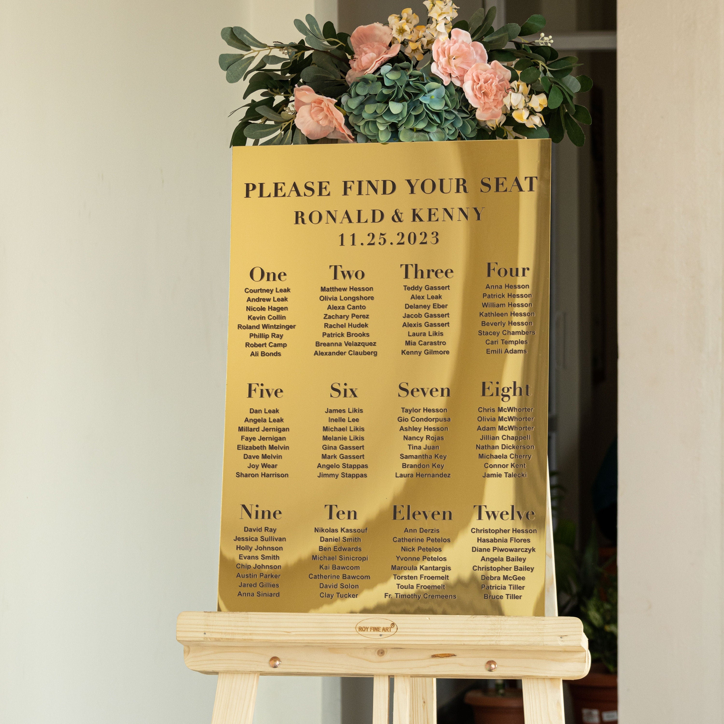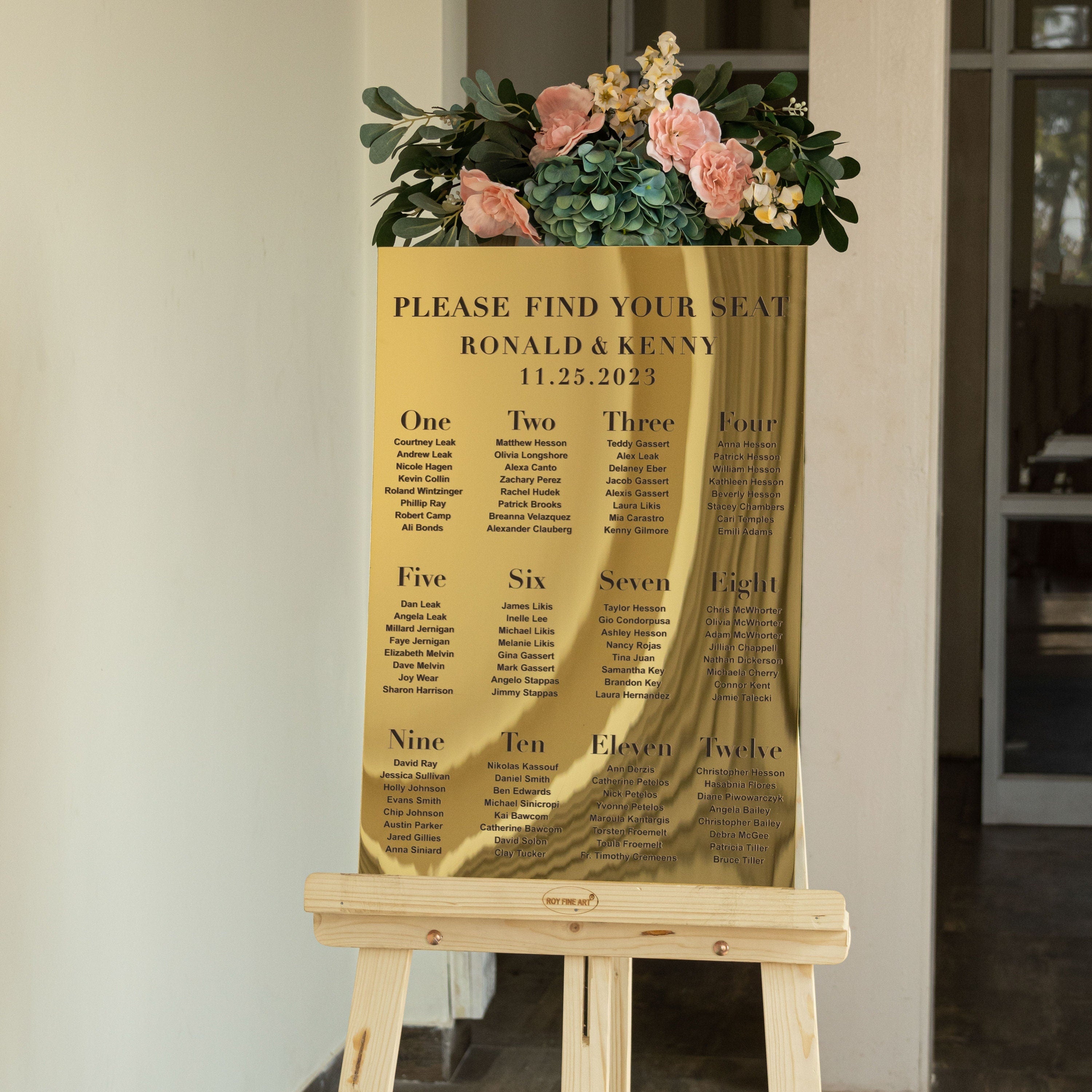 Personalized Acrylic UV Printed Seating Chart are a beautiful Wedding décor to welcome your guest. This modern wedding Seating Chart is made out of Mirror Gold acrylic sheet. We use UV Printing for best durability. * WE DO NOT USE VINYLS OR STICKERS.