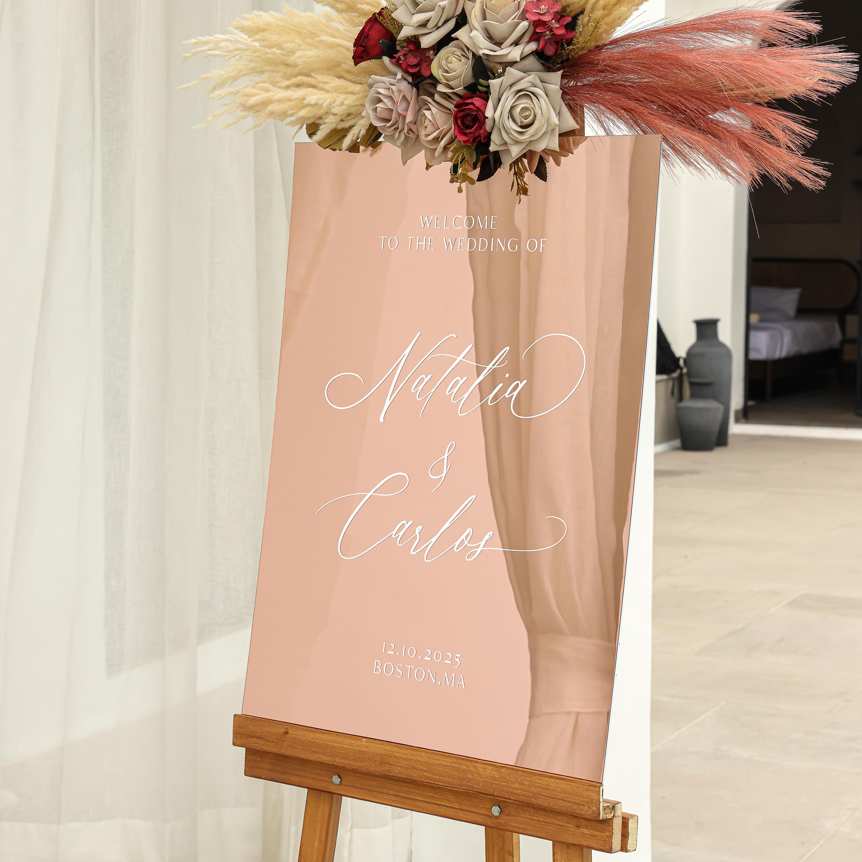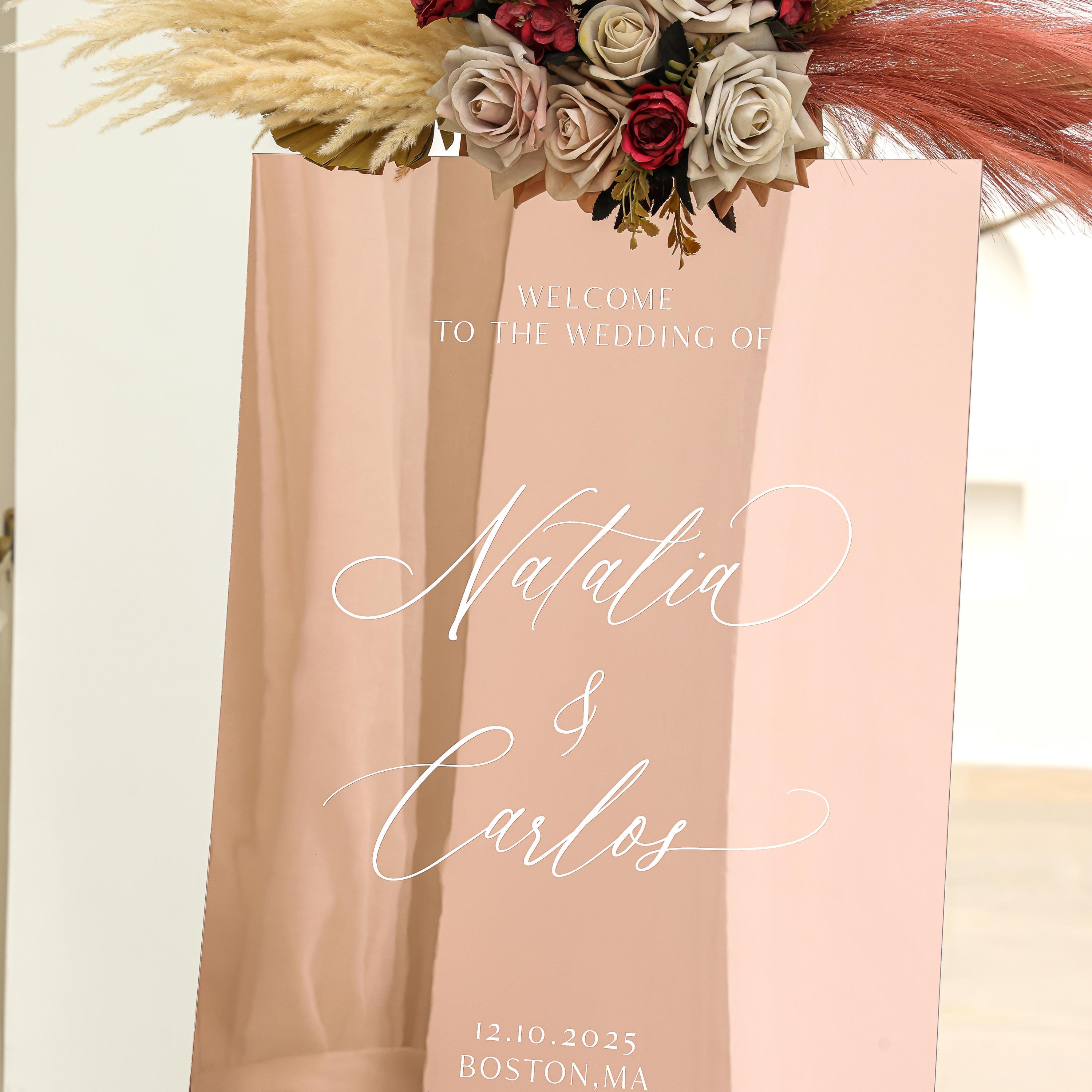 This modern wedding welcome signs is crafted from high-quality Mirror Rose Gold acrylic. The lettering is done using UV Printer, ensuring a long-lasting, luxurious finish. Unlike other signs that use vinyl or stickers.