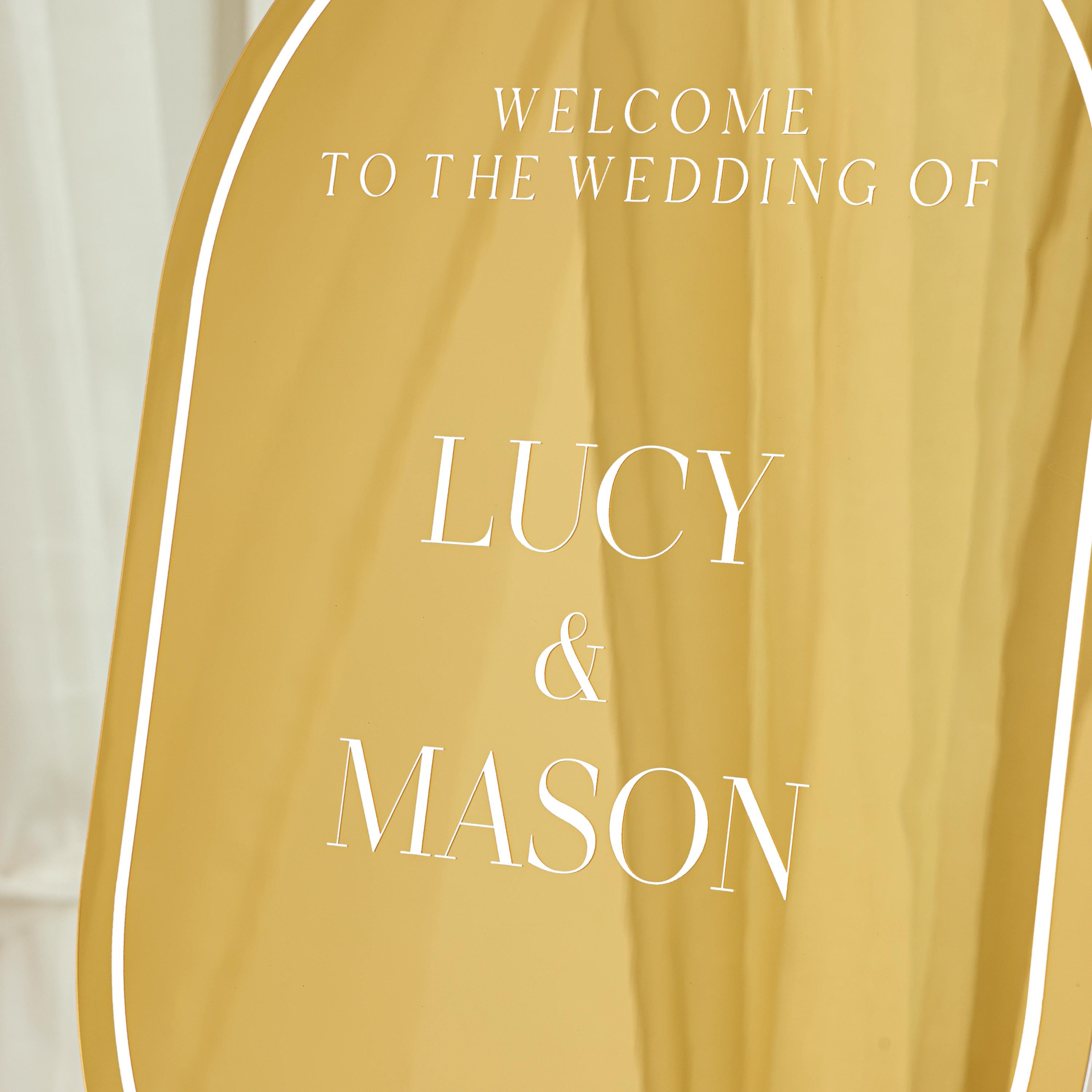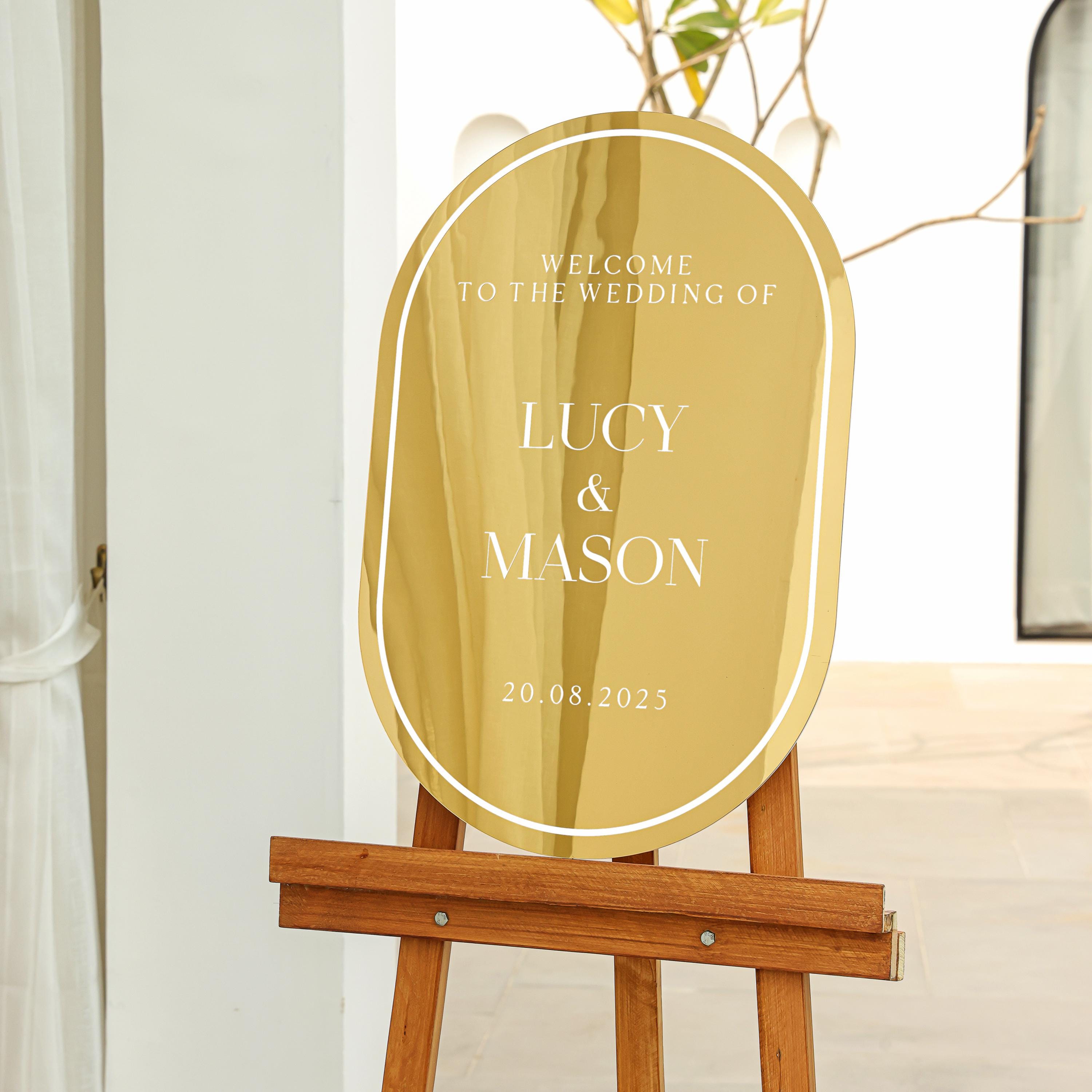 This modern Rounded wedding welcome signs is crafted from high-quality Mirror Gold acrylic. The lettering is done using UV Printer, ensuring a long-lasting, luxurious finish. Unlike other signs that use vinyl or stickers.