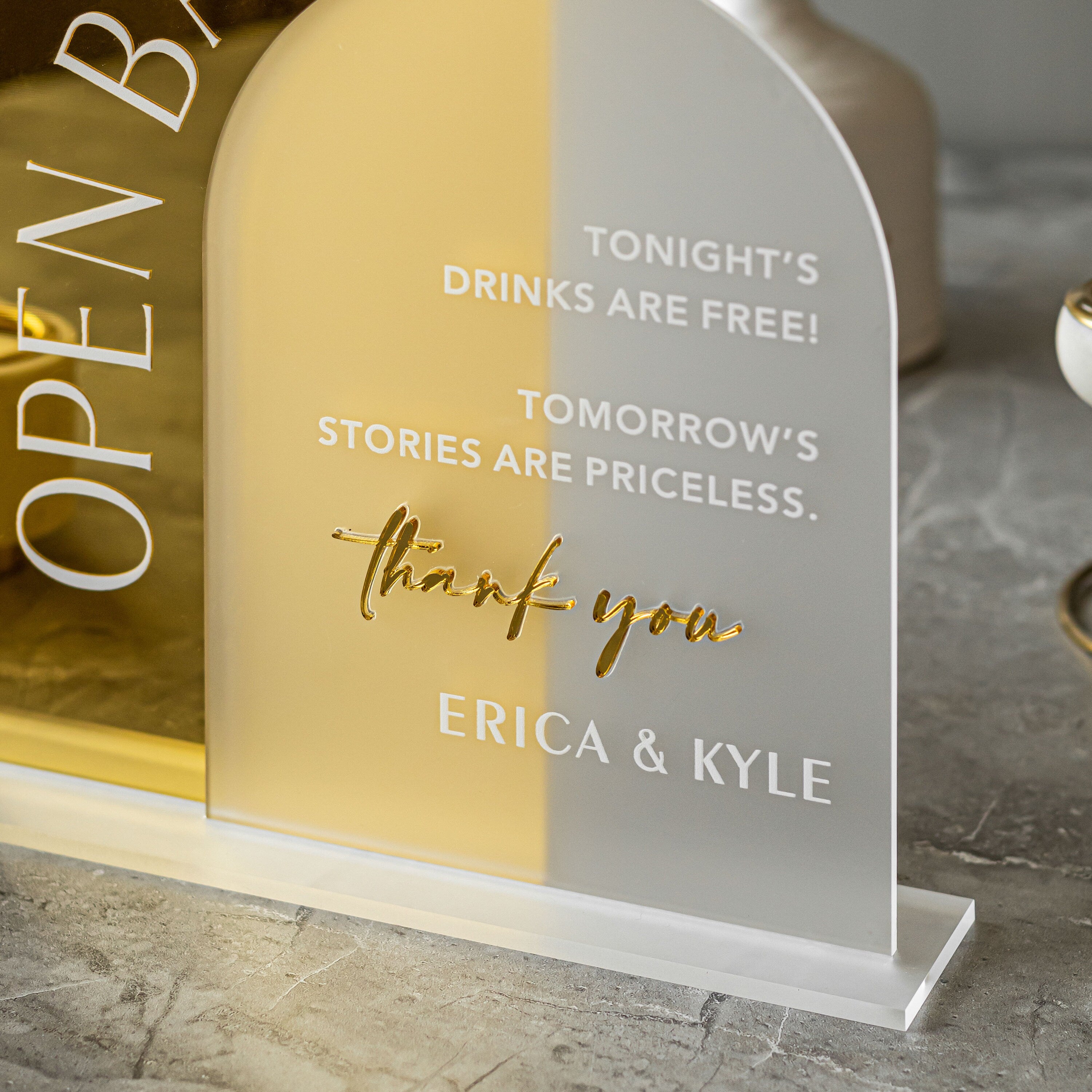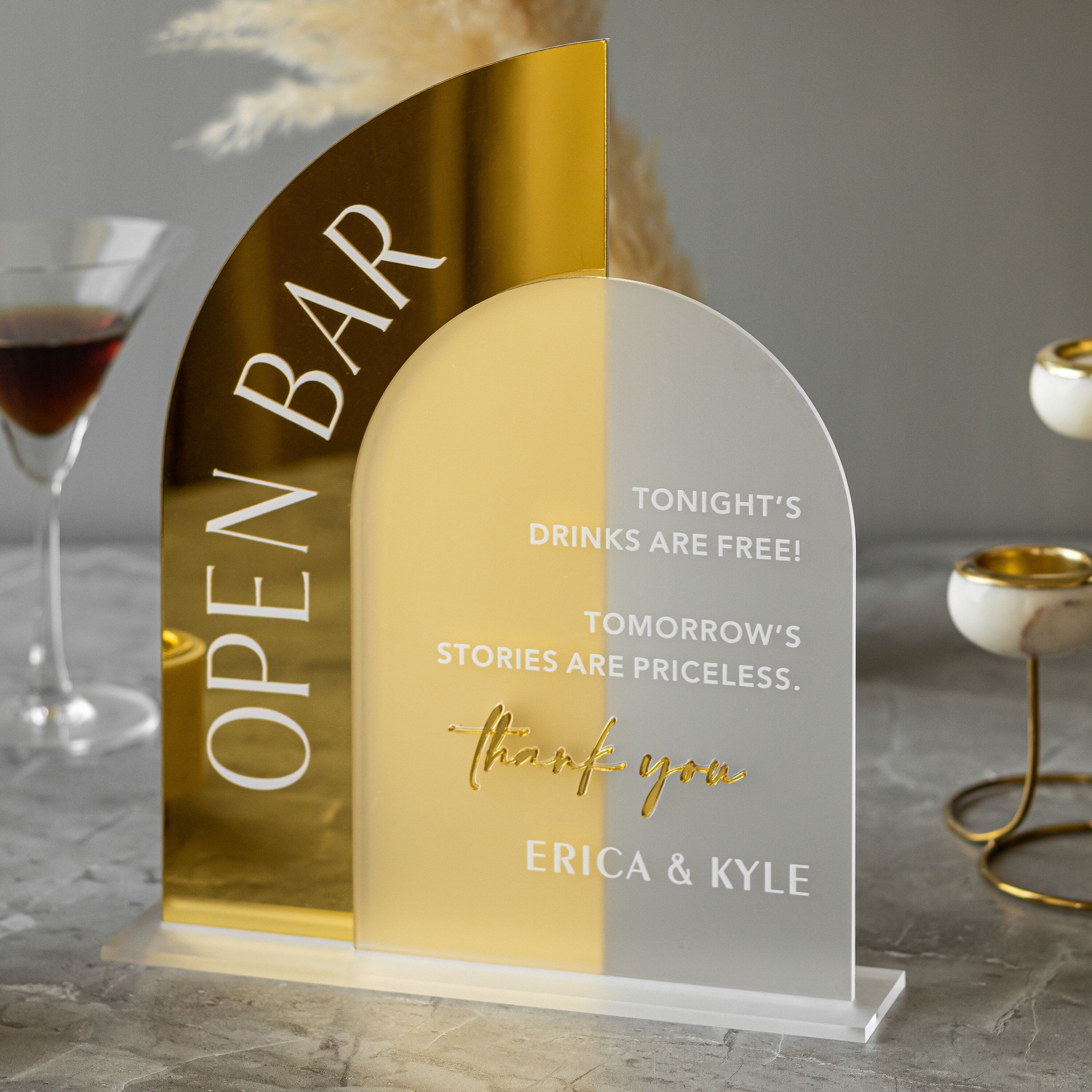 Open Bar Arched Wedding Sign, Open Bar Acrylic Sign, Wedding Table Decor, Gold Mirror Wedding Bar Sign...