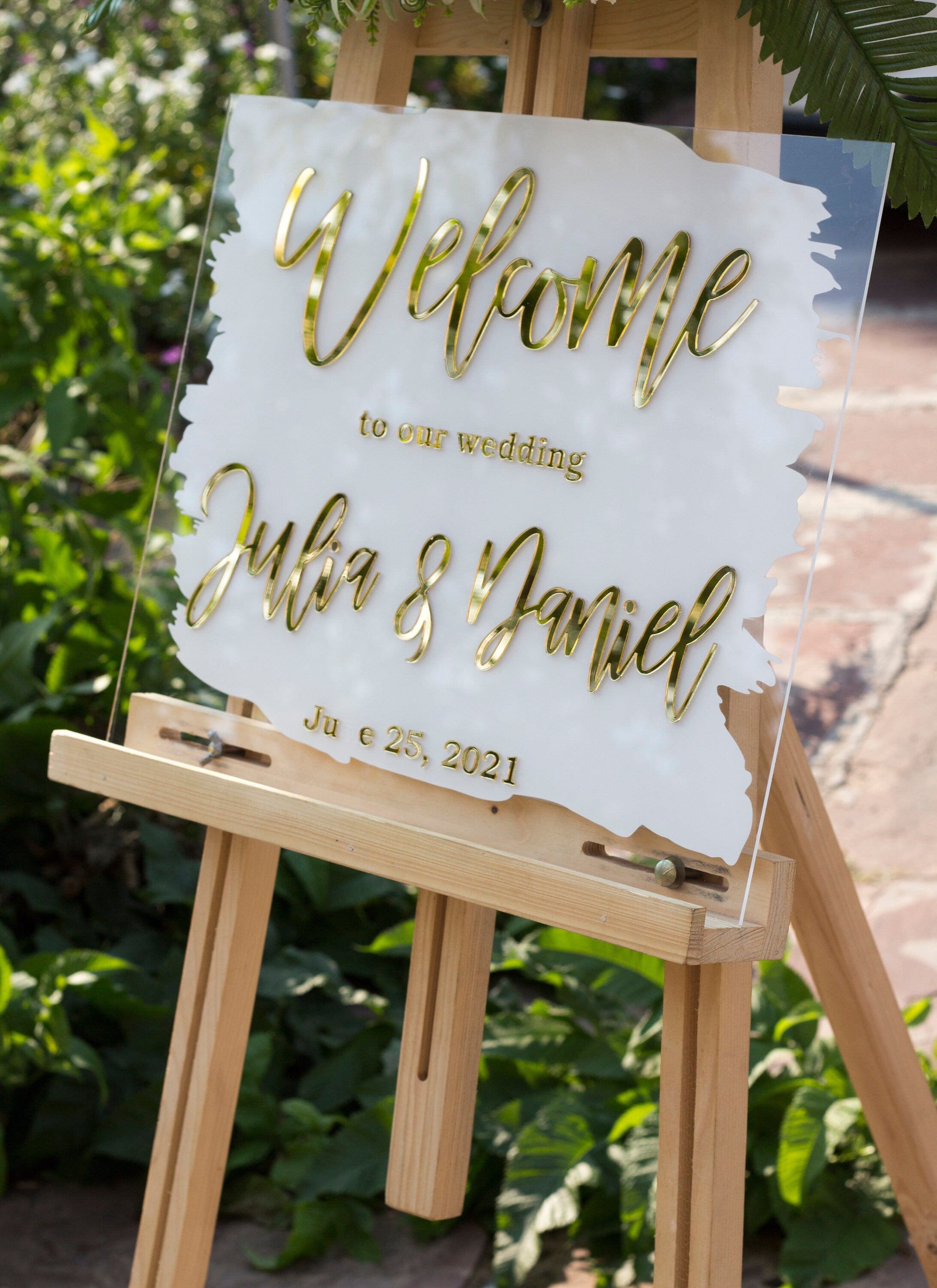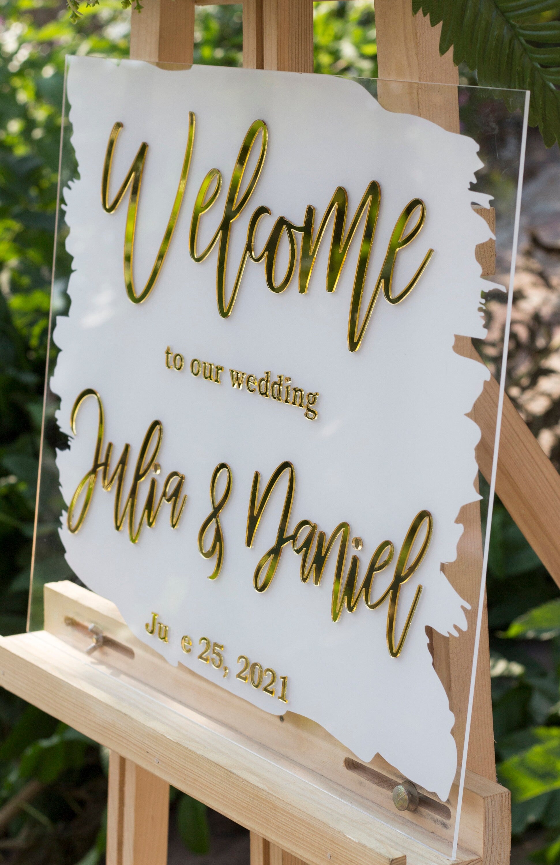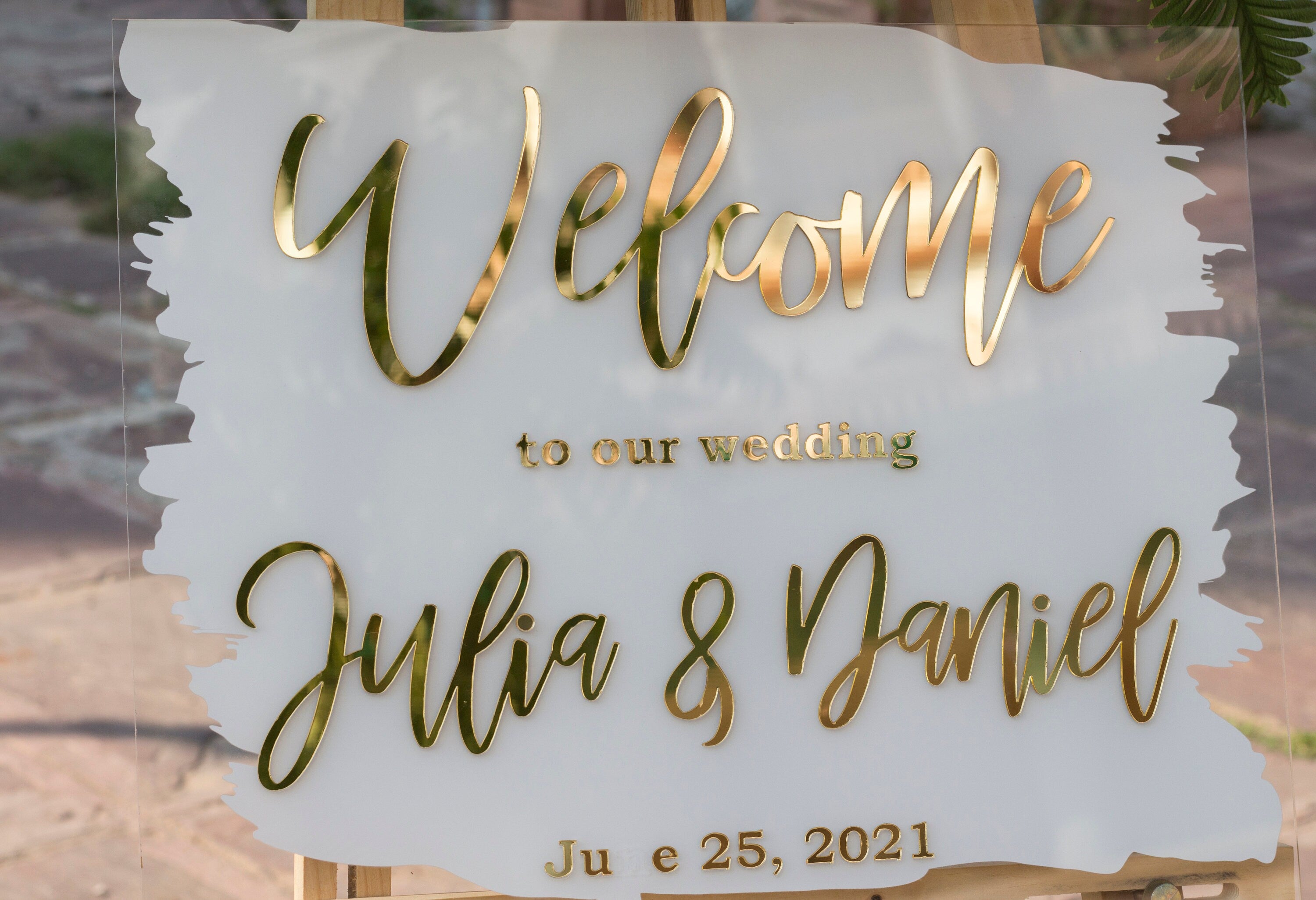 Personalized 3D Painted back Welcome signs are a beautiful Wedding décor to welcome your guest. This modern wedding welcome sign is made out of acrylic sheet. The lettering is of high quality Mirror Gold acrylic to make it more beautiful and long lasting.