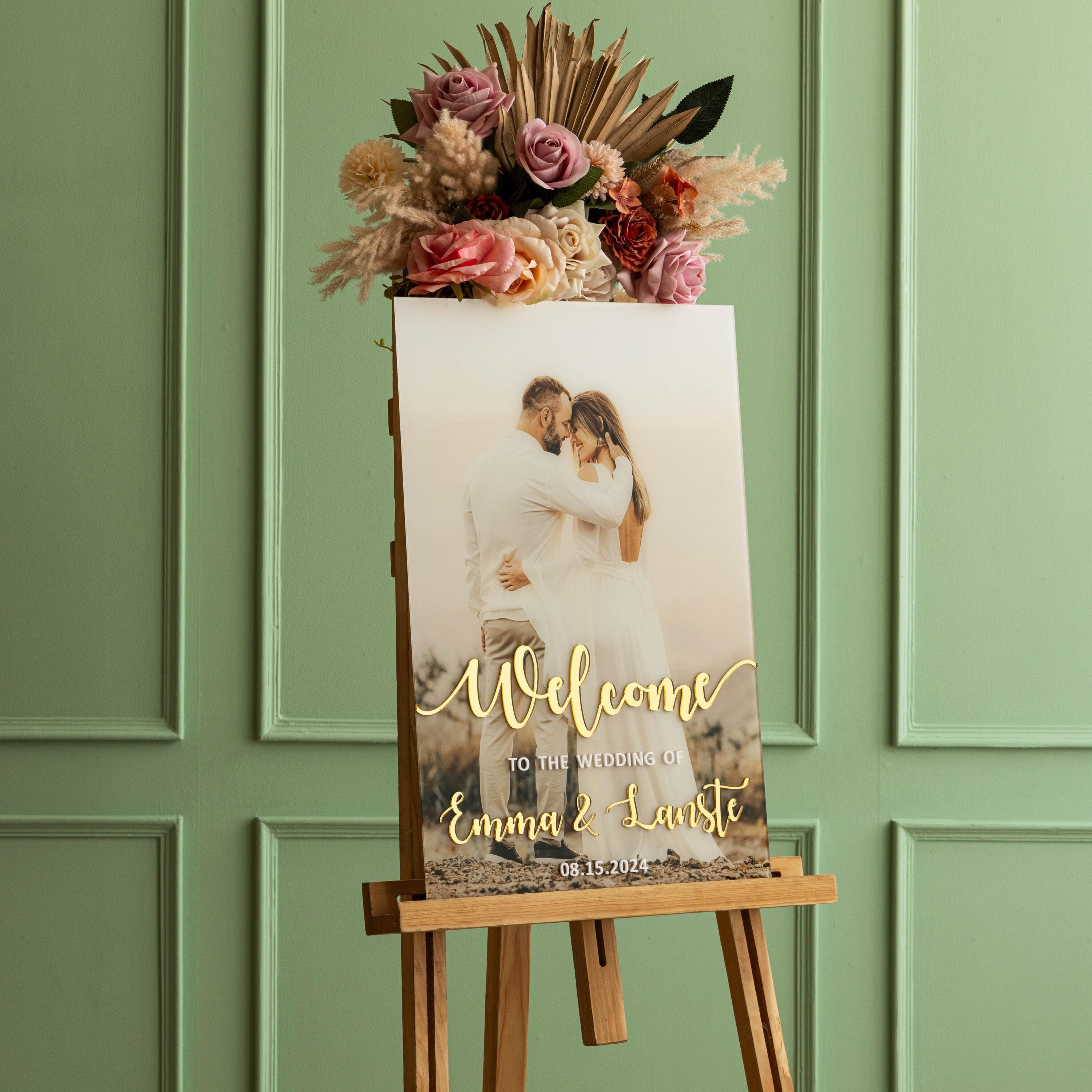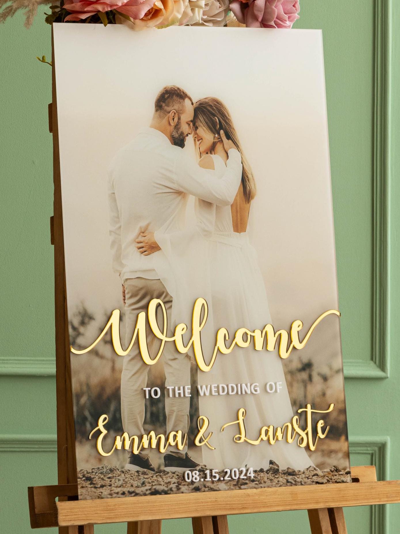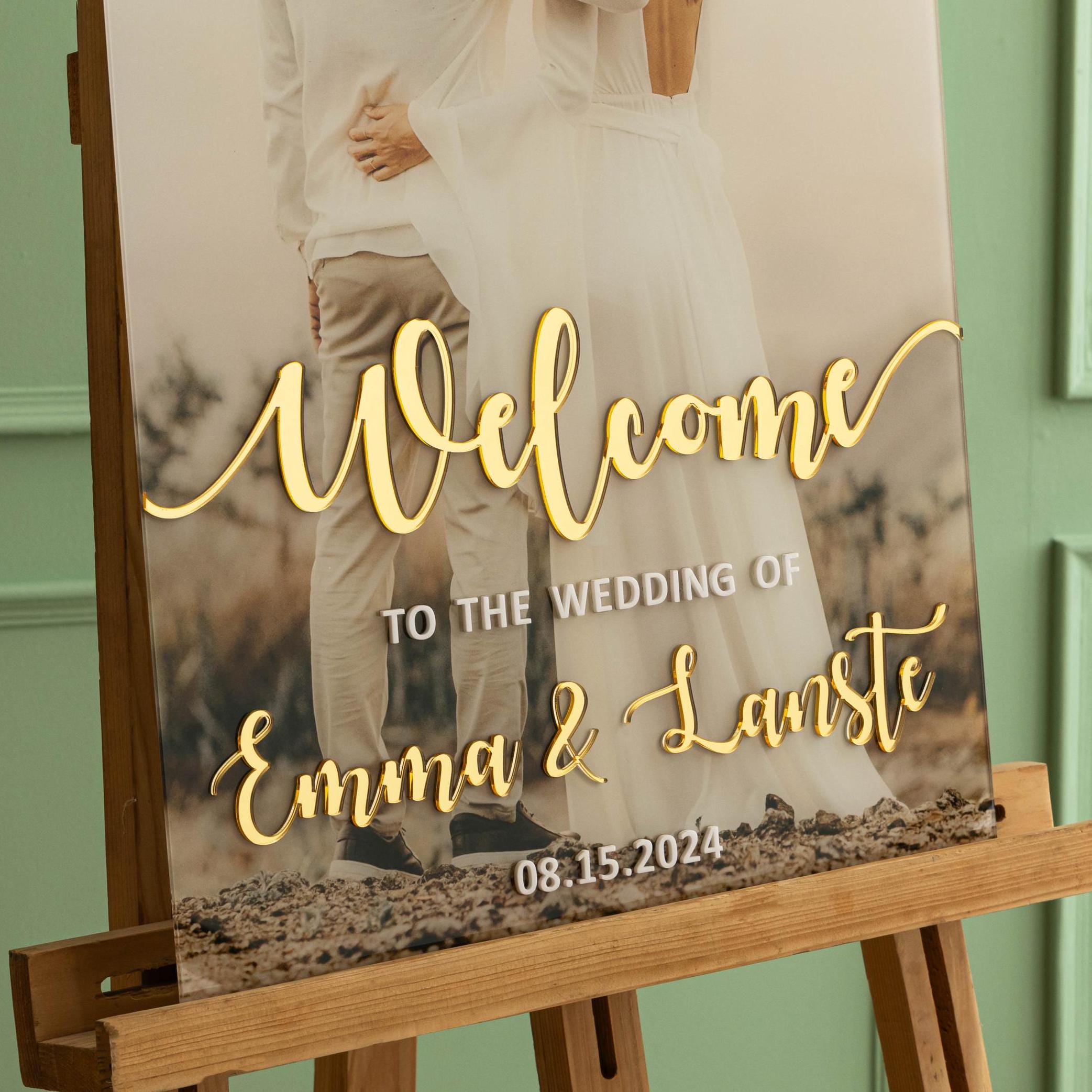 Personalized 3D Letters Photo Welcome signs are a beautiful Wedding décor to welcome your guest. This modern wedding welcome sign is made out of acrylic sheet. The lettering is of high quality Mirror gold acrylic and photo is UV printed to make it more beautiful and long lasting. We do not use vinyl or stickers.