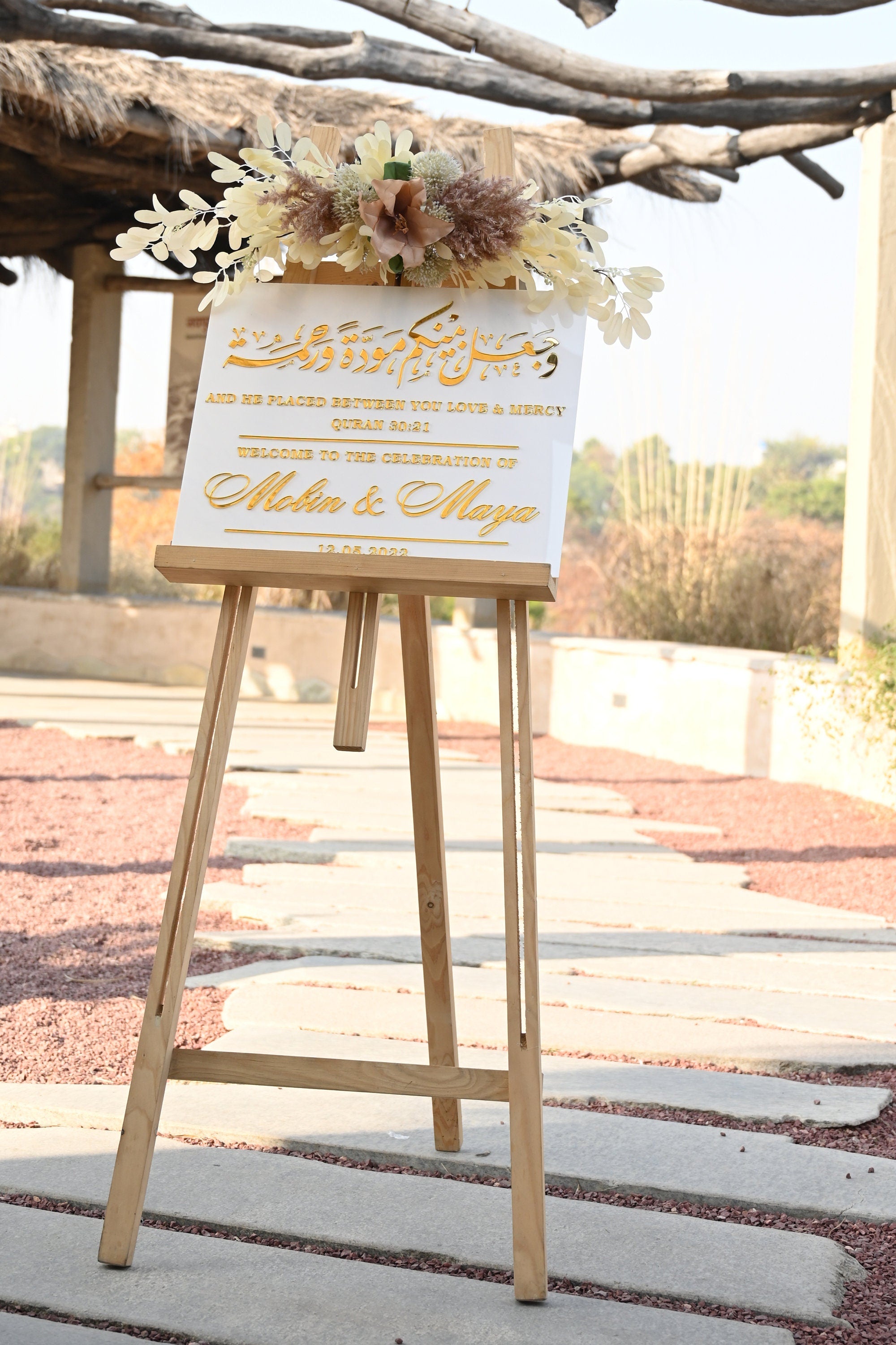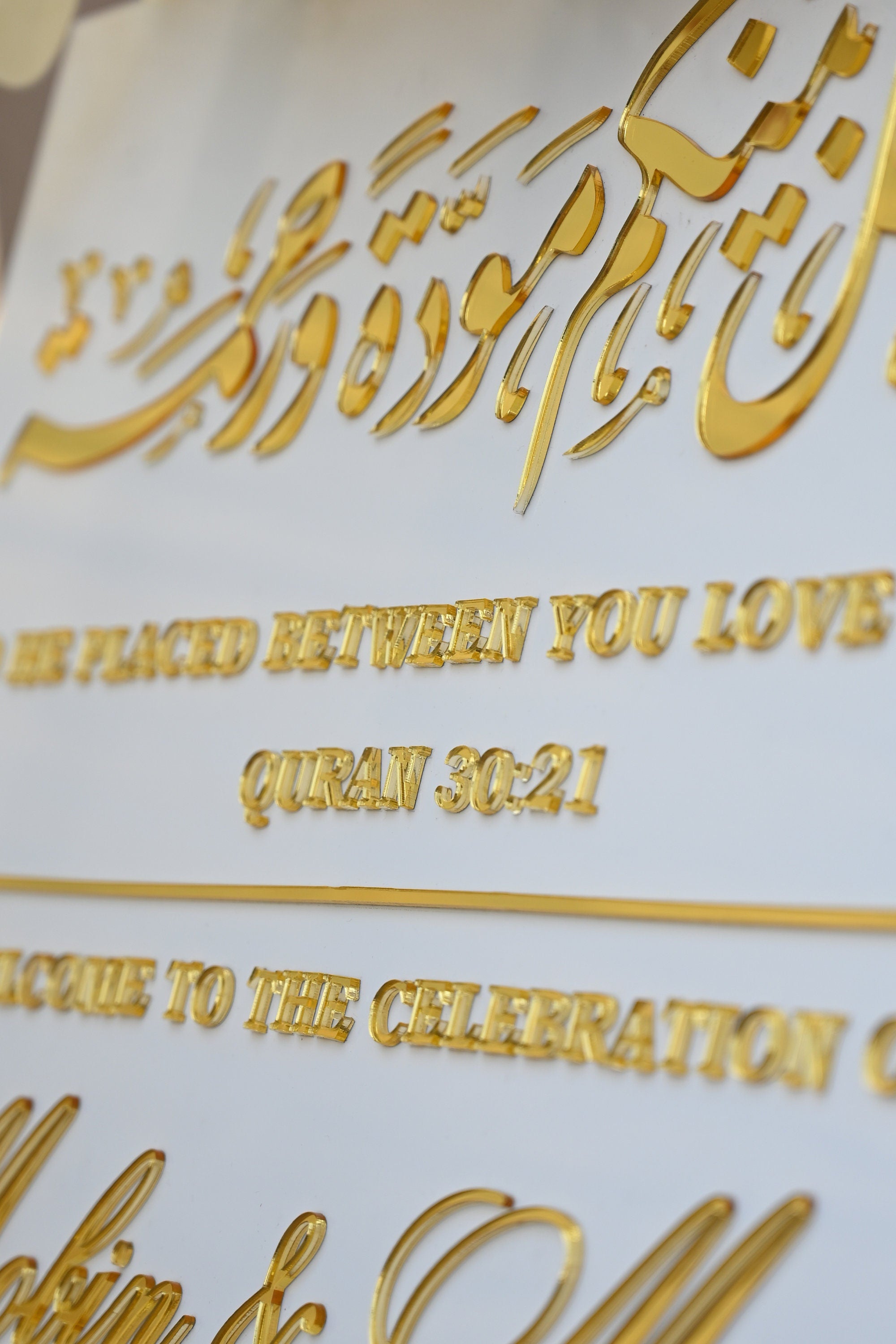 This modern Arabic wedding welcome sign is made out of acrylic sheet. The lettering is of high quality Mirror Gold acrylic to make it more beautiful and long lasting.