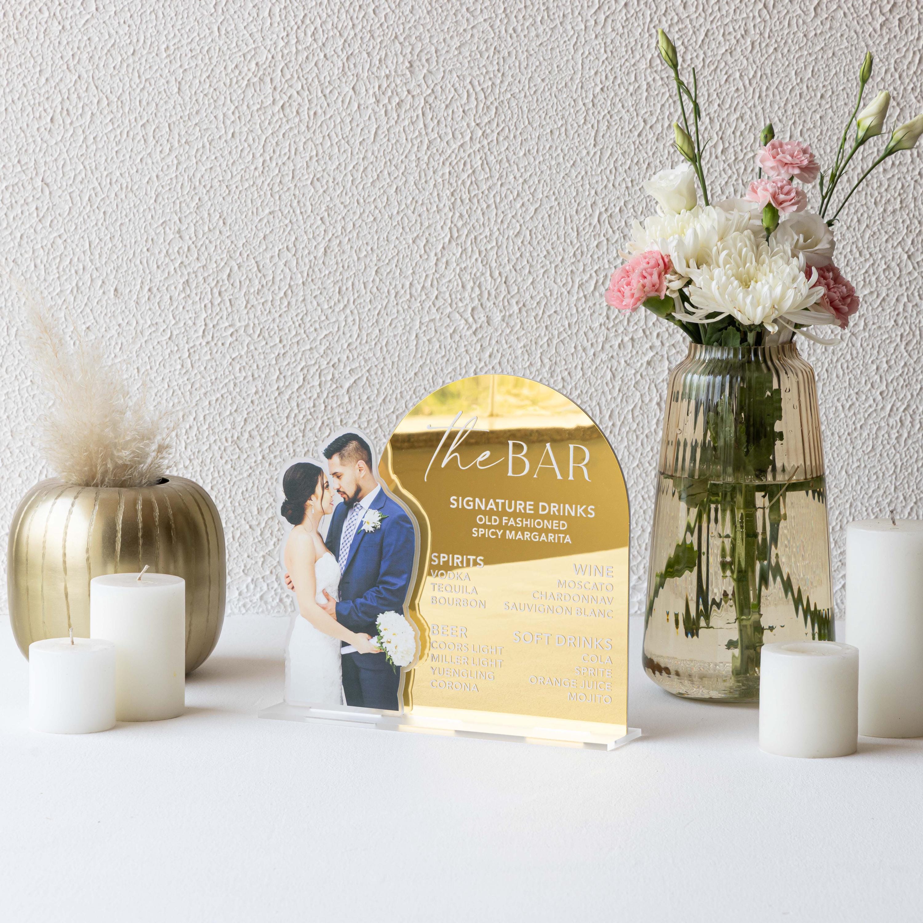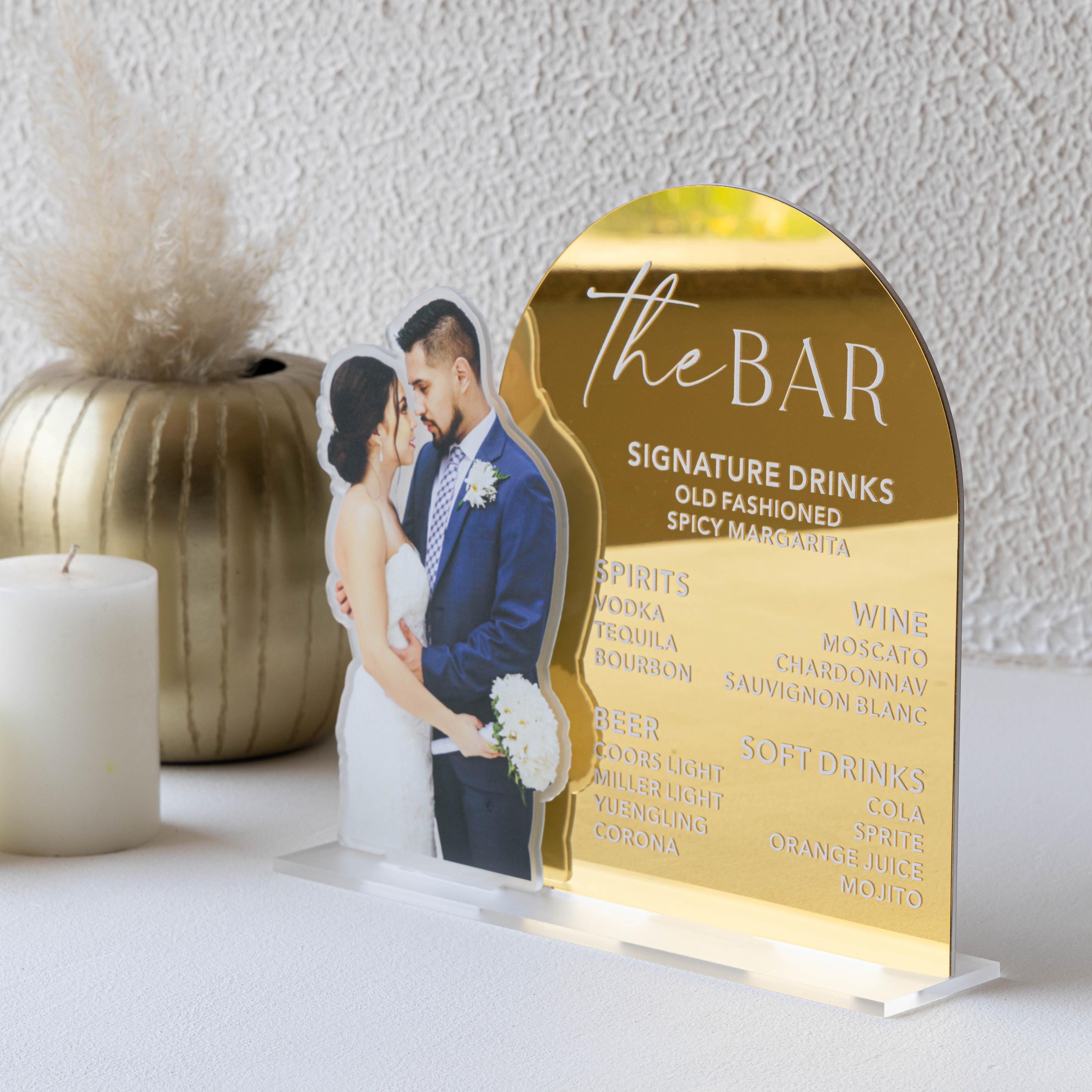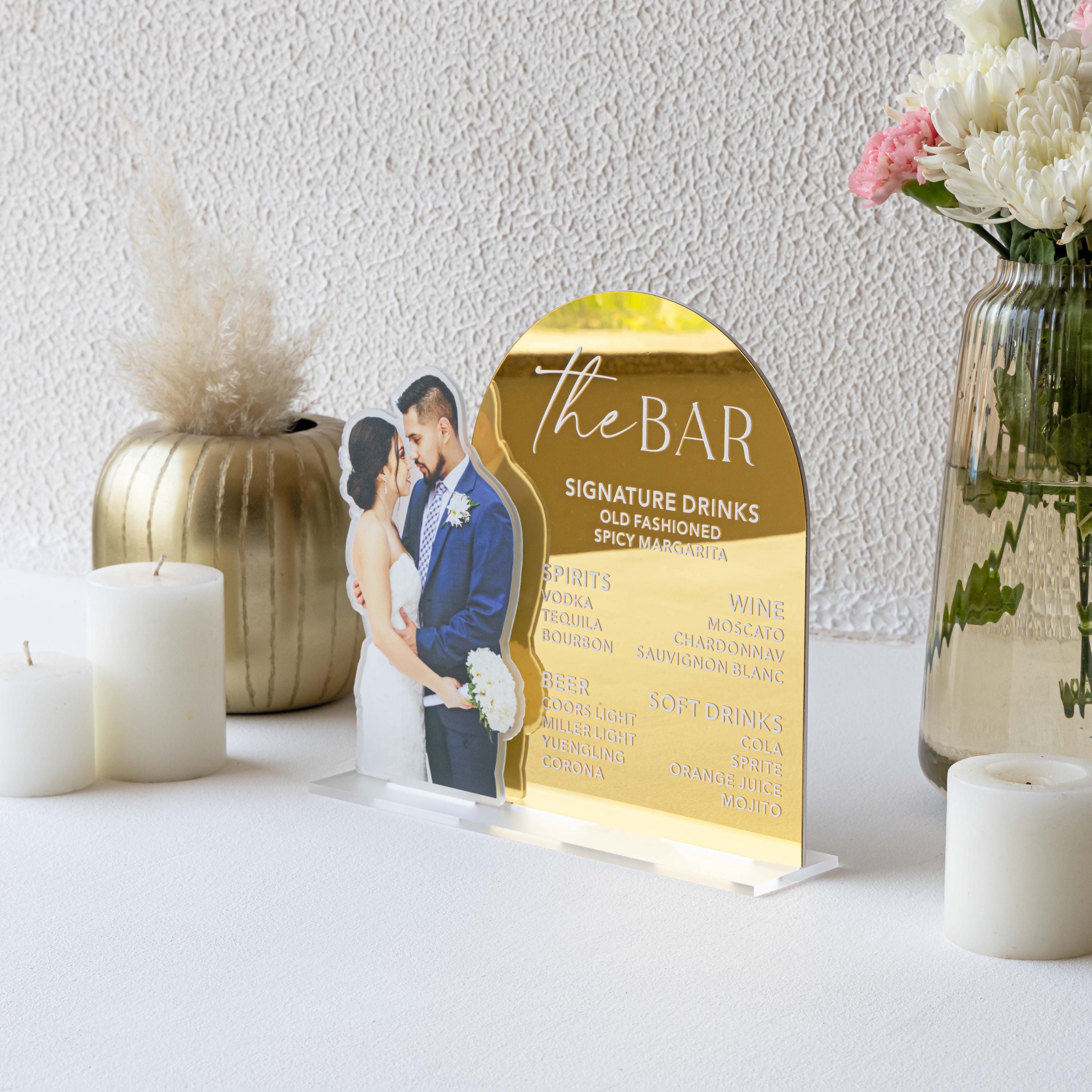 Make your big day unforgettable with our Mirror gold and Frosted Acrylic Wedding Bar Sign – a perfect blend of elegance and modern design. Handcrafted with care and attention to detail, this stunning piece is the ideal addition to your wedding bar decor, designed to impress your guests and elevate your celebration.