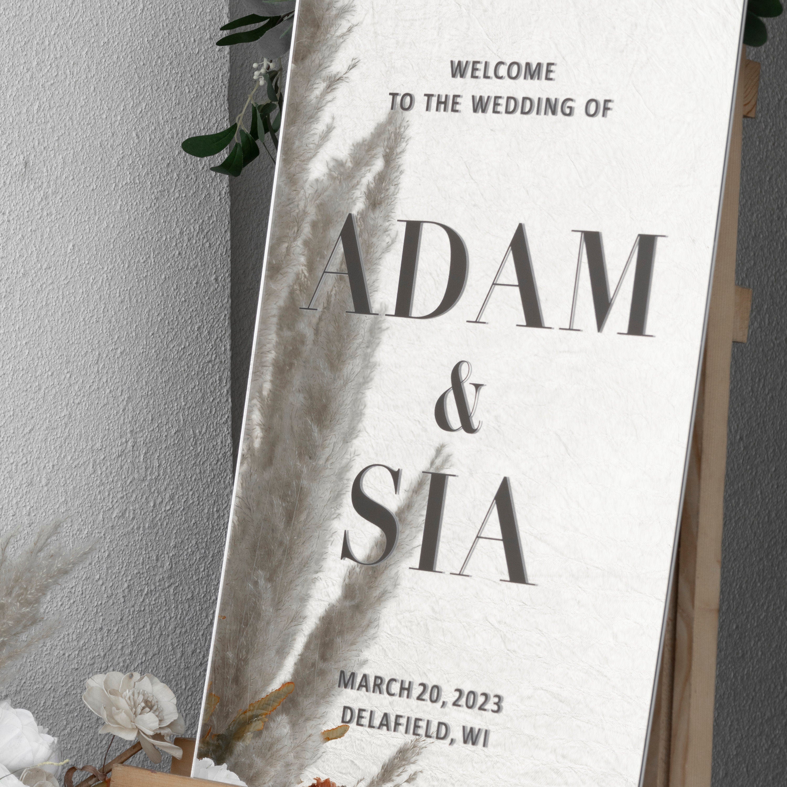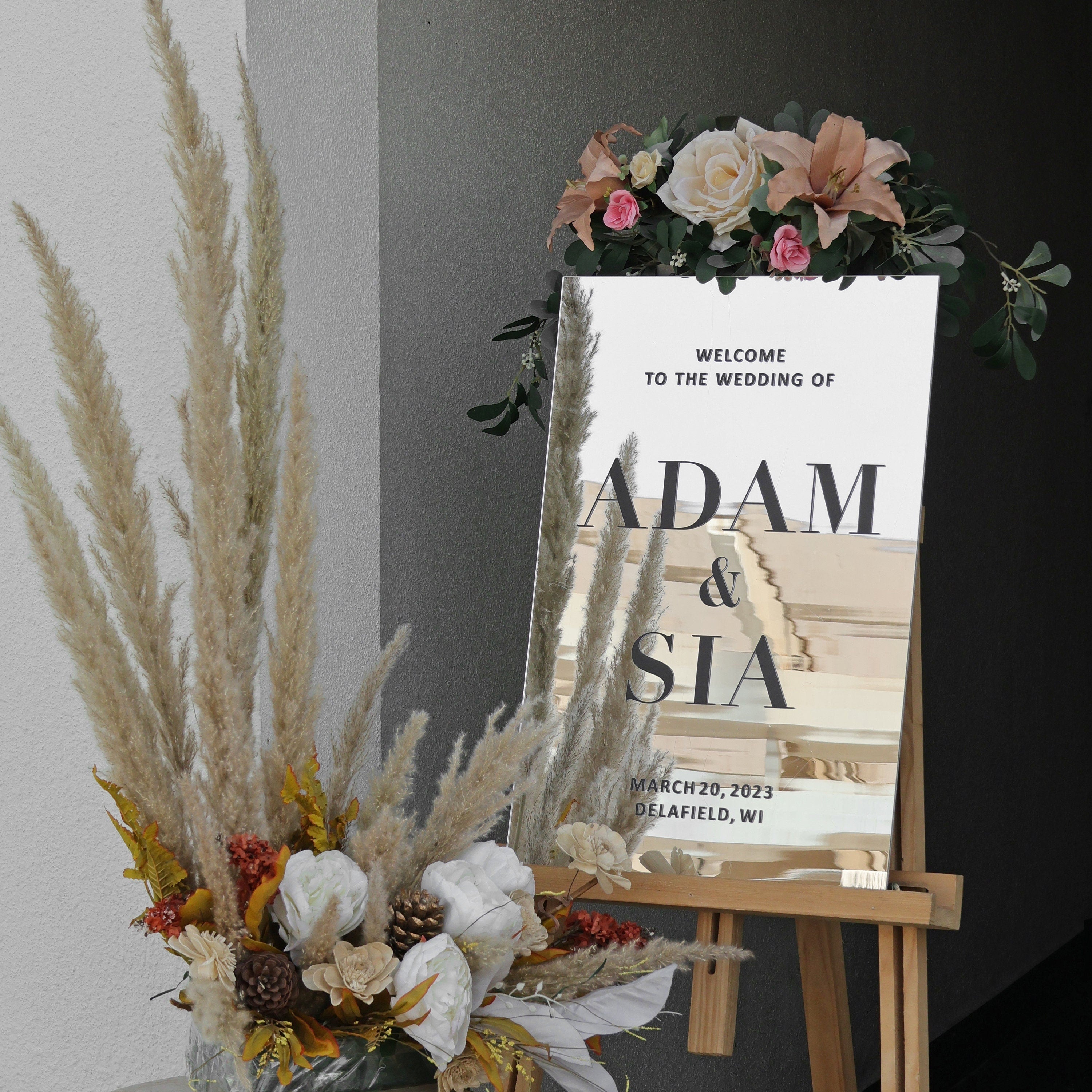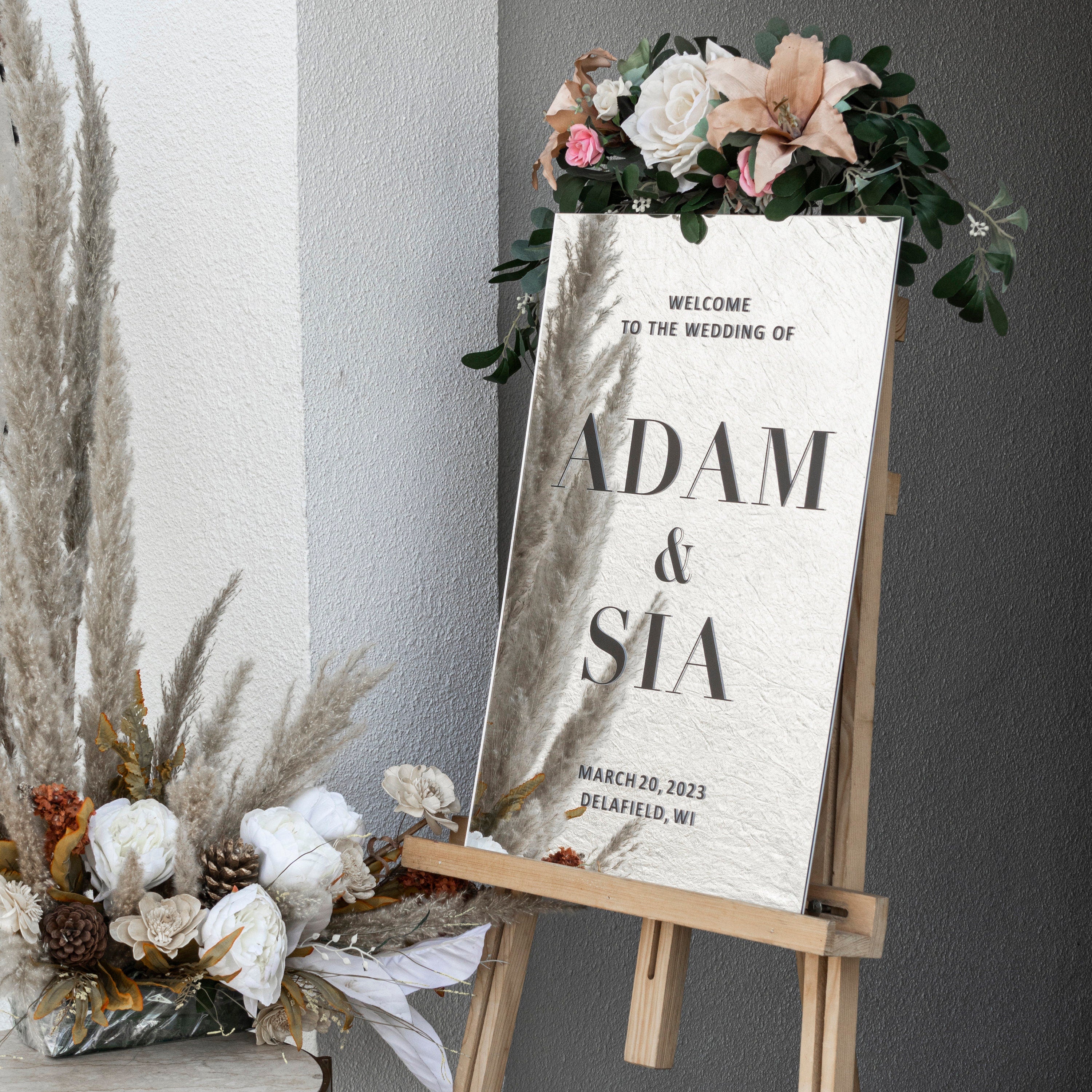 Personalized Welcome signs are a beautiful Wedding décor to welcome your guest. This modern wedding welcome sign is made out of Mirror Silver acrylic sheet. The lettering is done using UV printing machine to make it more beautiful and long lasting. We do not use vinyl or stickers.