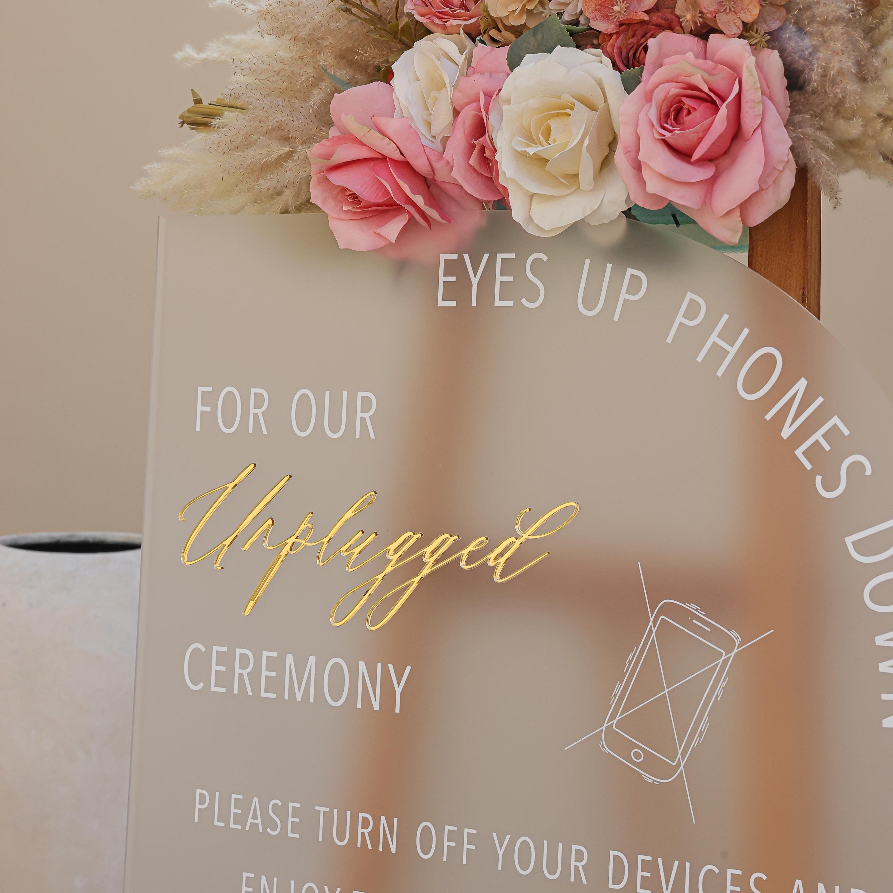 Make a lasting impression with our Personalized 3D Unplugged Ceremony Wedding Sign – a perfect addition to your wedding entrance decor. Crafted from high-quality Frosted acrylic, this custom wedding sign features elegant, raised 3D lettering in Mirror Gold Acrylic. We take pride in creating personalized wedding décor that is durable and long-lasting, without the use of vinyl or stickers. This custom acrylic wedding sign is the ideal choice to set the tone for your big day and is sure to impress.