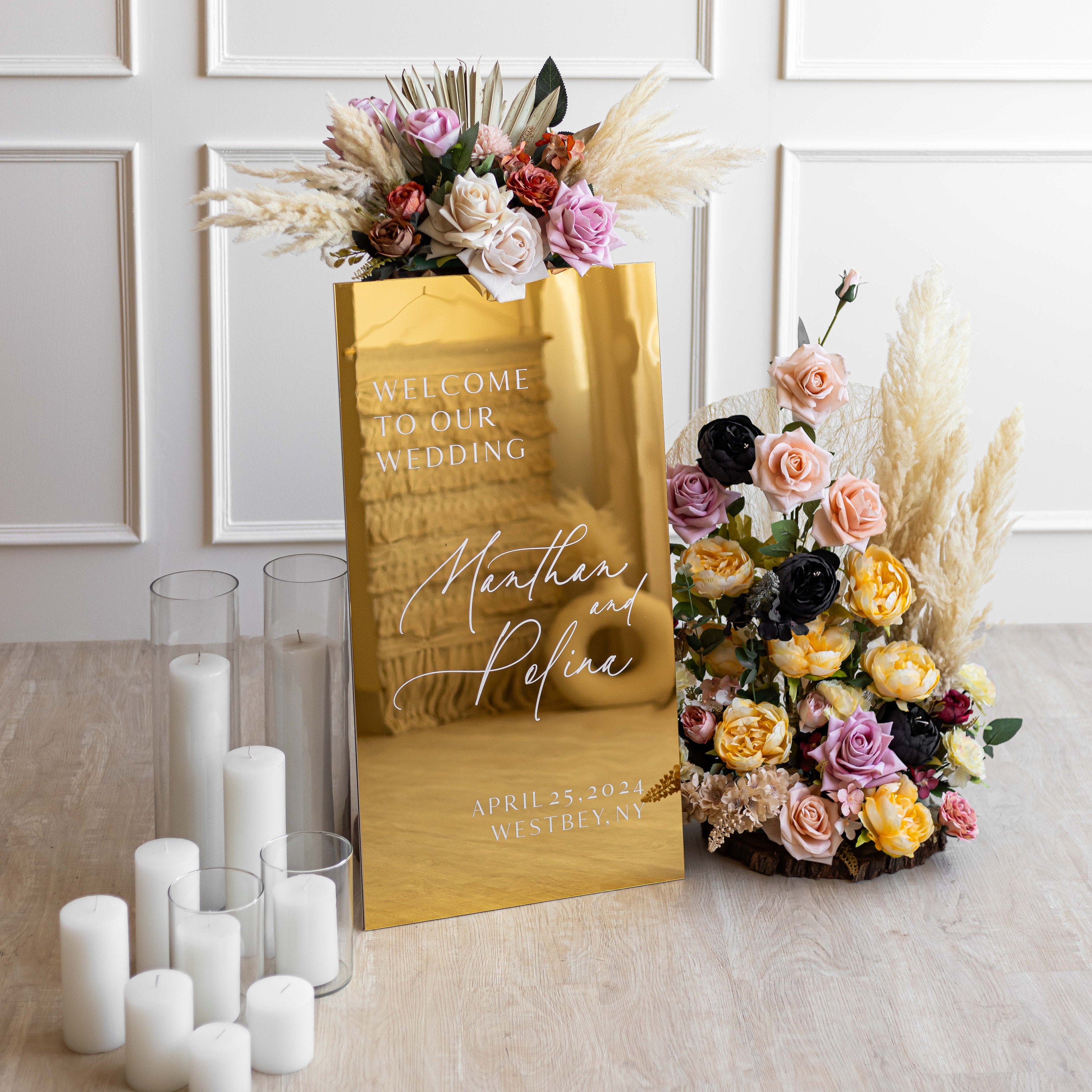 These modern wedding signs are made out of Mirror Gold acrylic sheet. The lettering is of high quality white UV printing to make it more beautiful and long lasting.
