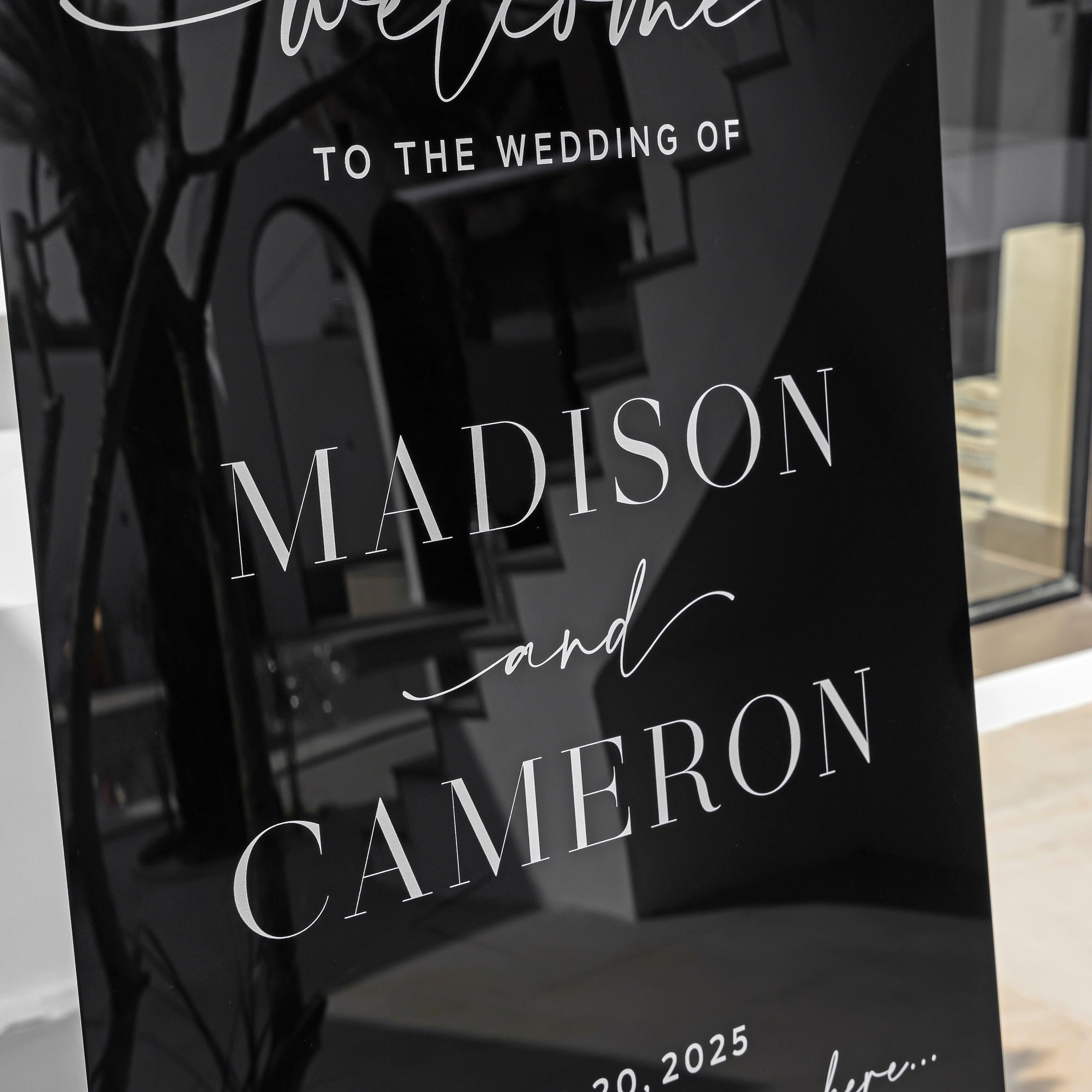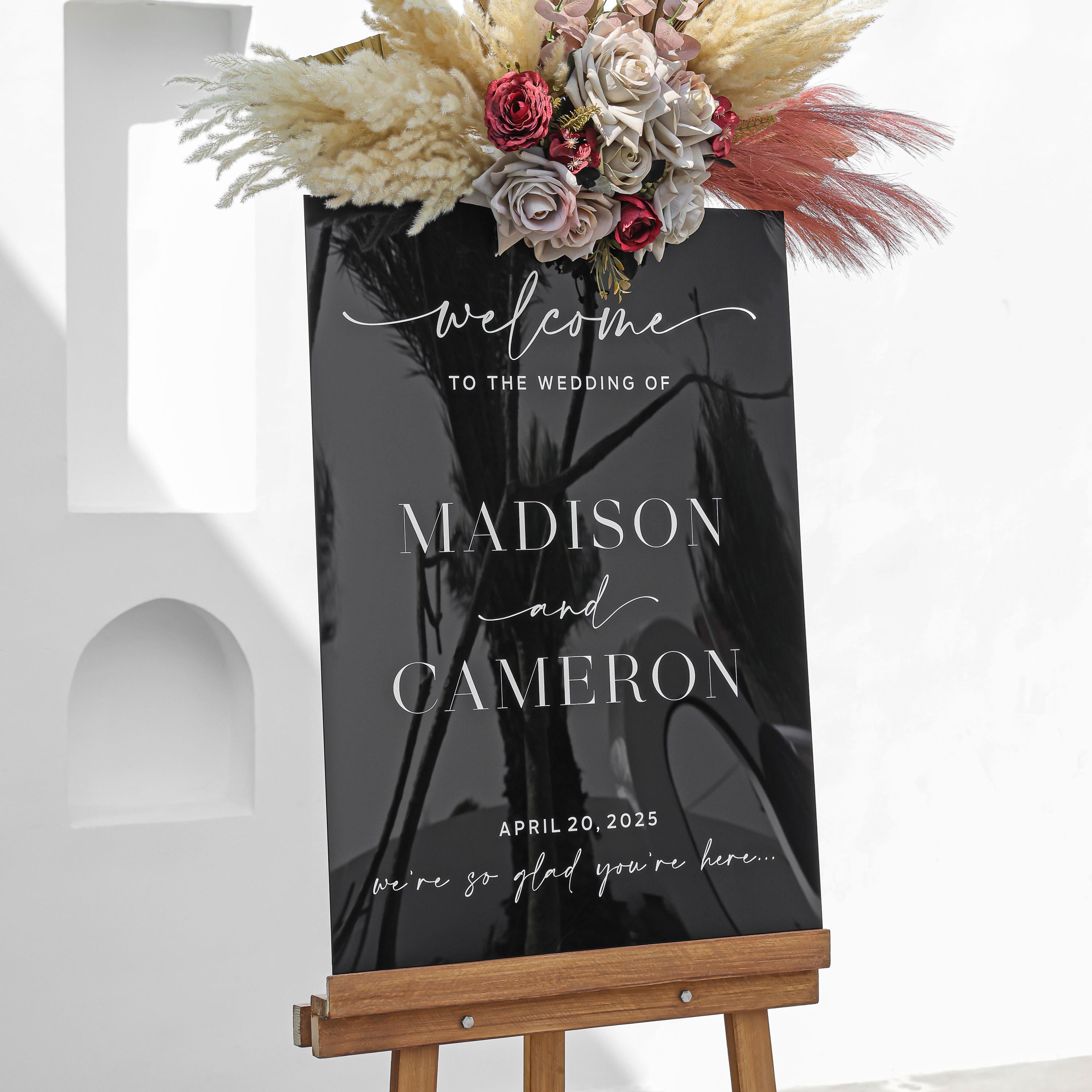 This modern wedding welcome signs is crafted from high-quality Black acrylic. The lettering is done UV Printer, ensuring a long-lasting, luxurious finish. Unlike other signs that use vinyl or stickers.