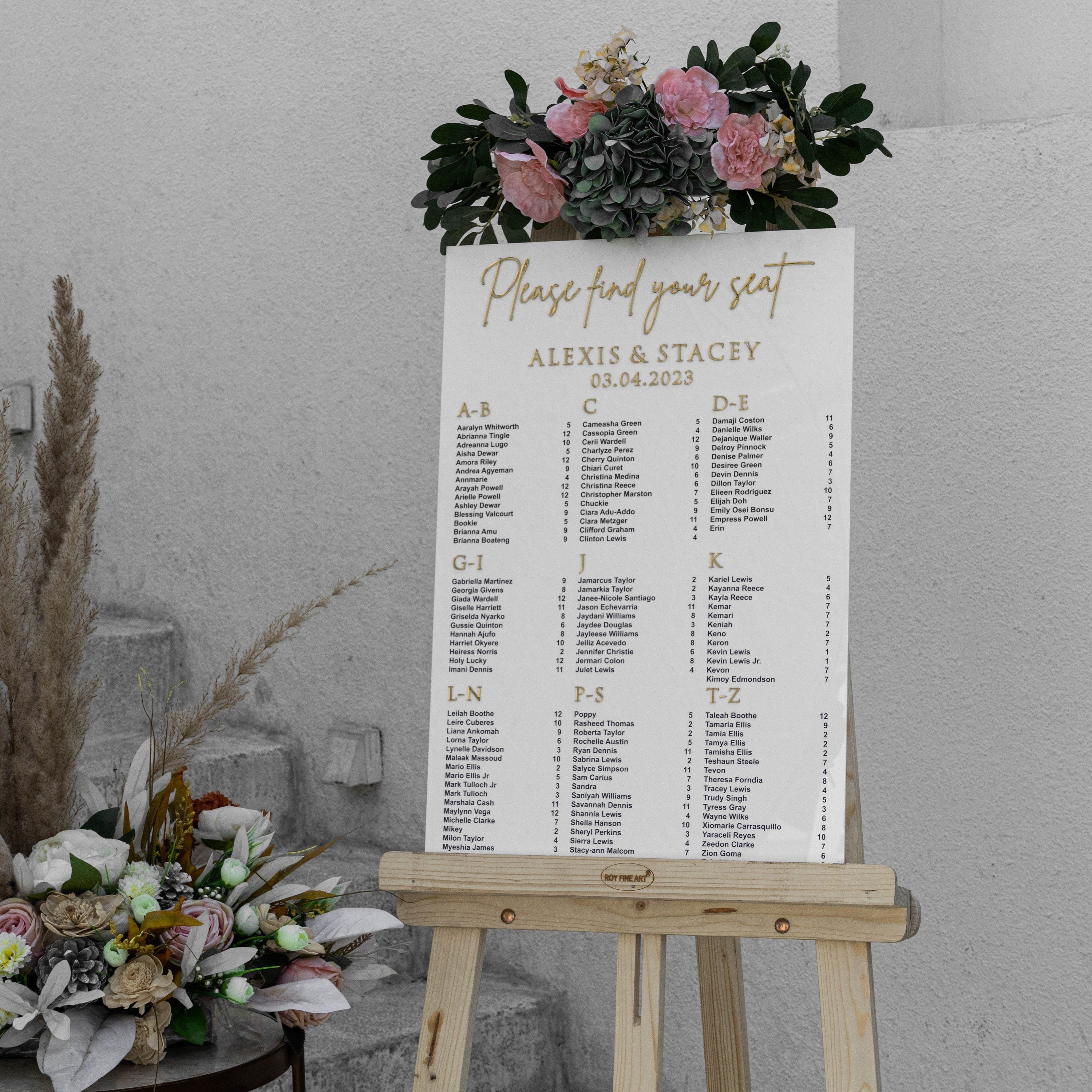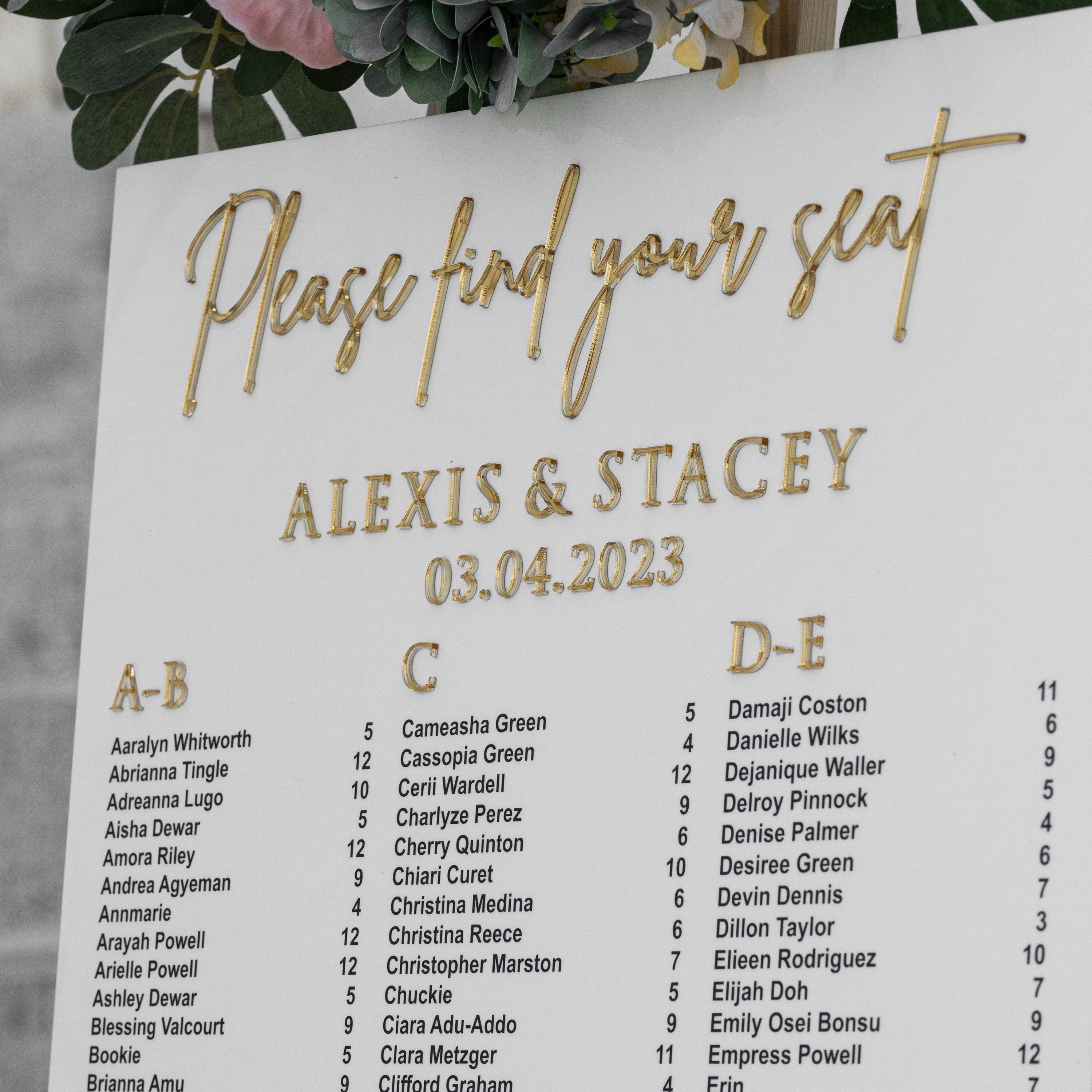Art of Affairs has always believed that “Wedding does not have to be Expensive, it has to be Memorable” , so in order to make it memorable we are determined to add all the love ,creativity and customized touch to the Wedding seat Signs. Customized Seating signs are a beautiful Wedding décor to welcome your guest. This modern wedding seating sign is made out of White acrylic base, Headings are 3D mirror gold and guest names are white UV Print, We do not use VINYL or stickers, we use UV Printing for best durability and better look.