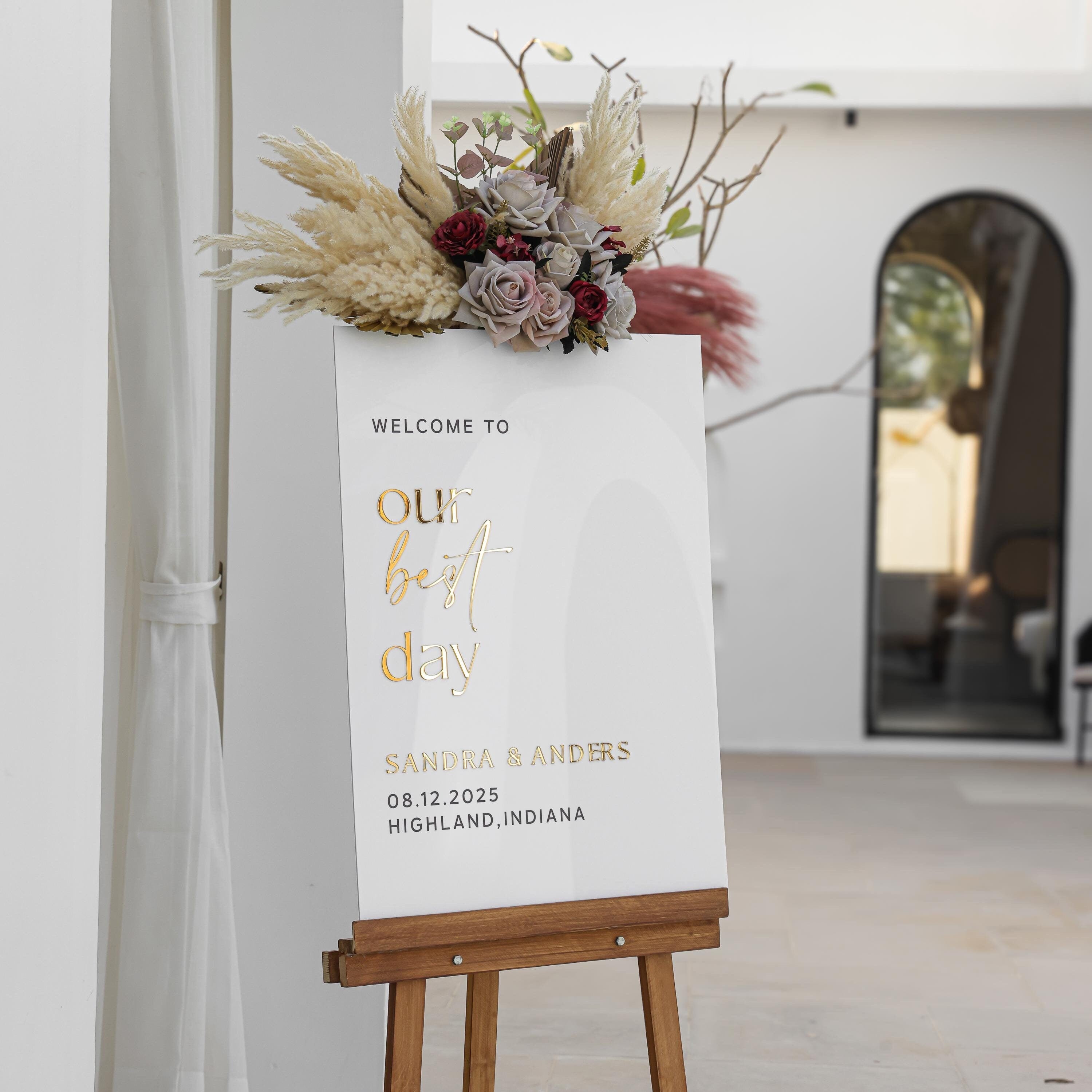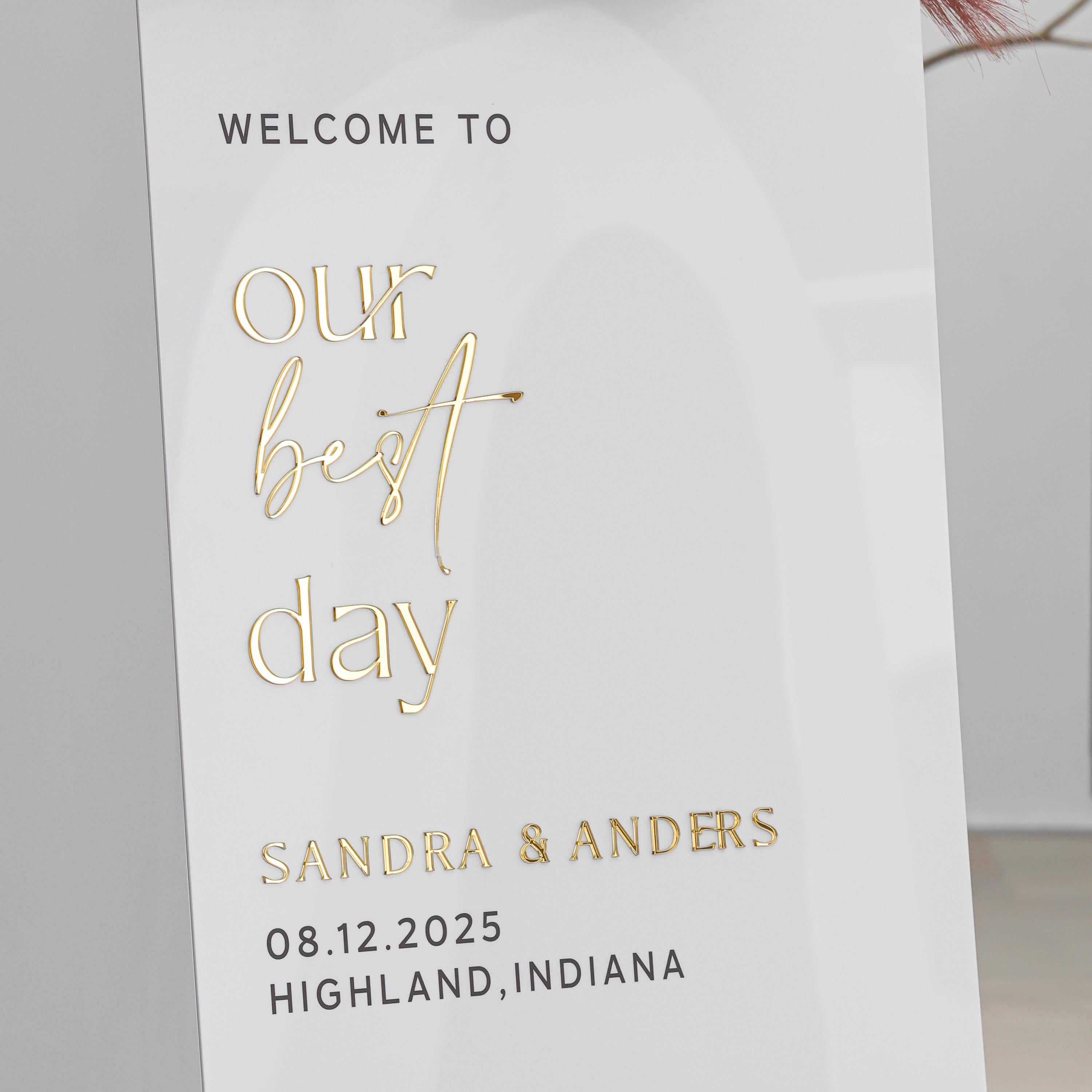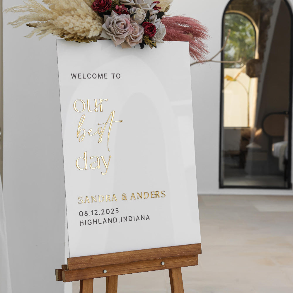 Our modern wedding welcome signs are crafted from high-quality white acrylic. The lettering is made from premium mirror gold acrylic, ensuring a long-lasting, luxurious finish. Unlike other signs that use vinyl or stickers, all of our letters are carefully raised using laser-cut acrylic to ensure precision and elegance.